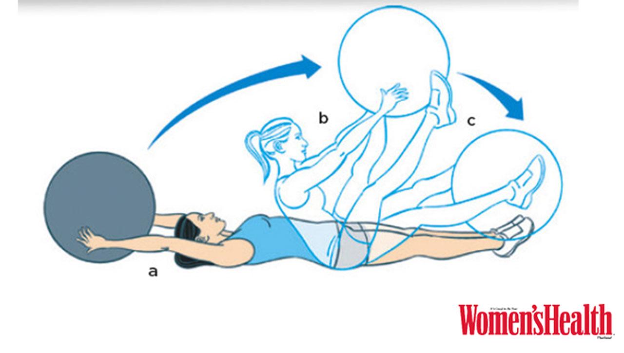 ขั้นแรกนอนหงายแล้วถือบอลไว้เหนือศีรษะ สองขาเหยียดตรง a) จากนั้นให้ยกตัวขึ้นพร้อมขาทั้งสองข้าง เกร็งแกนกลางลำตัวไว้ ก่อนส่งบอลโดยใช้เท้าทั้งสองข้างหนีบบอลไว้ให้แน่น b) จากนั้นลดแขนและขาลงกลับสู่พื้น c) ในท่าเดียวกันให้ส่งบอลจากเท้ากลับสู่มือ นับ 1 ครั้ง ทำ 10 ครั้ง