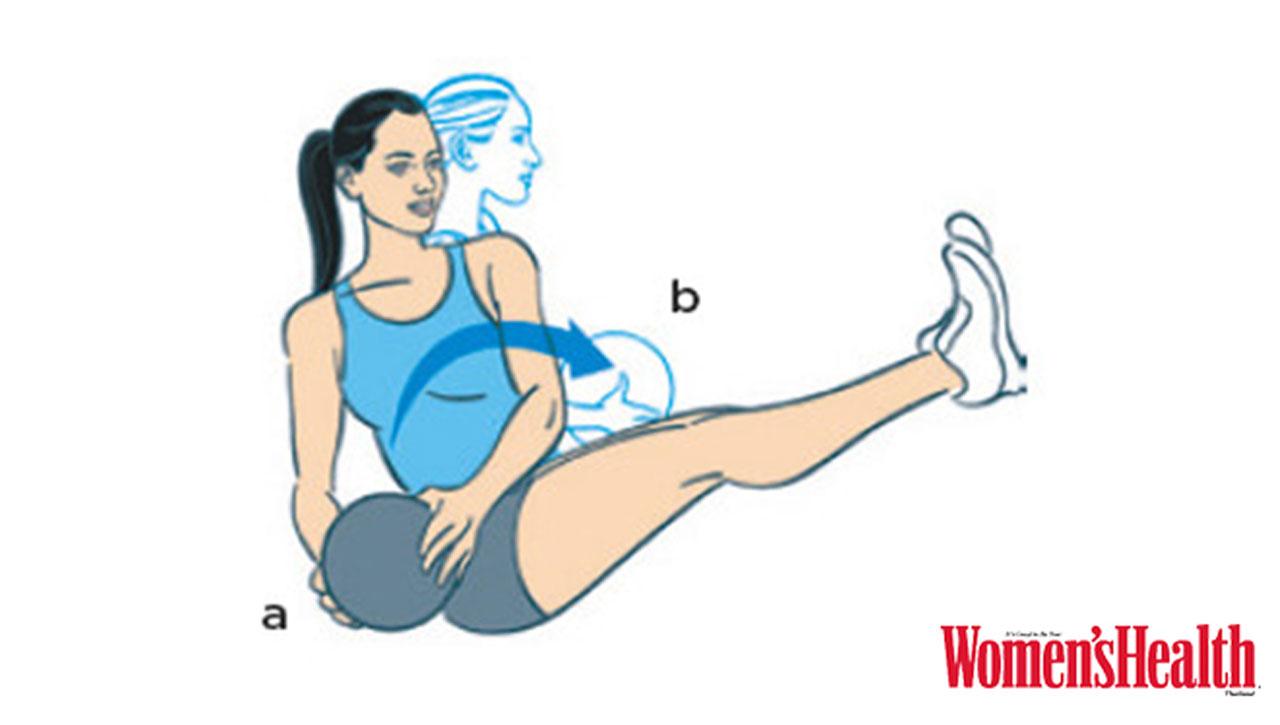 นั่งบนพื้น ถือเมดิซีนบอลไว้ในมือ จากนั้นยกขาทั้งสองข้างให้ลอยจากพื้น พยายามเหยียดแขนตรงไปข้างหน้า ก่อนหมุนไหล่บิดตัวเอาบอลแตะพื้นข้างซ้ายลำตัว 1 ครั้ง นับเป็น 1 ครั้ง a) ทำซ้ำเหมือนเดิมเพียงแต่สลับข้าง b) ทำสลับข้าง 30 ครั้ง (หากยากเกินไปอนุญาตให้งอเข่า 90 องศา หรือชันเข่าวางเท้าทั้งสองข้างไว้บนพื้น)