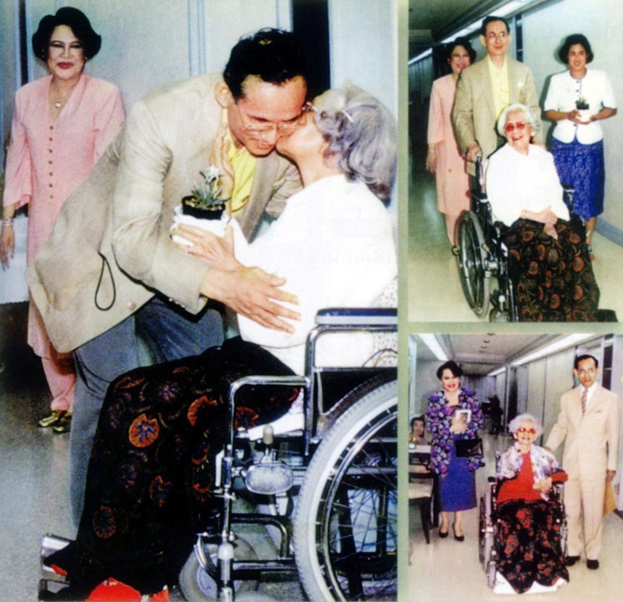 มีครั้งหนึ่ง ในหลวงรัชกาลที่ 9 ทรงพระประชวร สมเด็จย่าก็ทรง พระประชวร ประทับรักษาพระองค์ที่โรงพยาบาลศิริราชด้วยกัน แต่อยู่คนละมุมตึก ตอนเช้าพระเจ้าอยู่หัวทรงเปิดประตูแอ๊ดออกมา พยาบาลกำลังเข็นรถสมเด็จย่าออกมารับลมผ่านหน้าห้องพอดี พระเจ้าอยู่หัวทรงเห็นแม่ ก็รีบออกจากห้องมาแย่งพยาบาลเข็นรถ