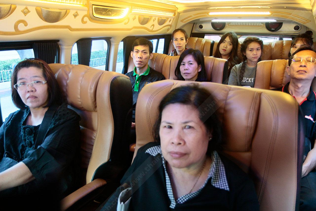 ก่อนที่เราจะเขยิบตัวไปชะโงกหน้ามองในรถตู้ ที่ติดป้ายว่า "ครอบครัวศรีสุพรรณ" ให้บริการฟรี เนื่องจากรถตู้มีฟิล์มที่ดำทึบ จึงไม่มั่นใจสักเท่าไรนัก แต่เราก็พบผู้โดยสารที่นั่งอยู่ภายในรถแล้ว 4 คน