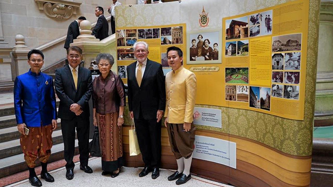 งานครั้งนี้นับว่ามีความสำคัญยิ่ง โดย นางกอบลาภ โปษะกฤษณะ นายกสมาคมนักเรียนเก่าสวิสส์ฯ ได้นำข้อมูลและรูปภาพที่มีอยู่จัดทำนิทรรศการ “ตามรอยเบื้องพระยุคลบาท” เพื่อเผยแพร่พระราชประวัติของครอบครัวมหิดล นับตั้งแต่เสด็จฯมาประทับในครั้งแรก หลังจากที่สมเด็จพระศรีนครินทราบรมราชชนนี ทรงมีพระประสูติกาลพระบาทสมเด็จพระเจ้าอยู่หัวอานันทมหิดล และในครั้งที่ 2 เมื่อครอบครัวมหิดลได้ย้ายมาประทับที่โลซานน์ หลังจากที่สมเด็จพระบรม