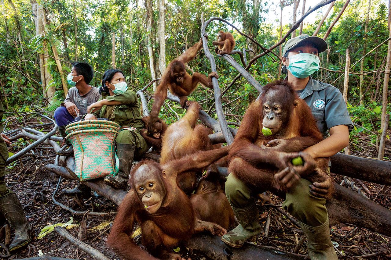 ที่ศูนย์ฟื้นฟูสัตว์ป่าหลายแห่ง เช่น ศูนย์ช่วยเหลือสัตว์ป่านานาชาติ (International Animal Rescue) ใกล้กูนุงปาลุง การมีลูกอุรังอุตังกำพร้าเข้ามาอย่างต่อเนื่องแสดงว่า การลักลอบล่ายังคงเป็นปัญหาร้ายแรง ปัจจุบันมีอุรังอุตังมากว่าพันตัวอาศัยอยู่ตามศูนย์ฟื้นฟูสัตว์ป่าต่างๆ แต่ความพยายามสอนทักษะการเอาชีวิตรอดให้อุรังอุตังเยาว์วัยยังเป็นความท้าทายและไม่ได้รับการพิสูจน์
