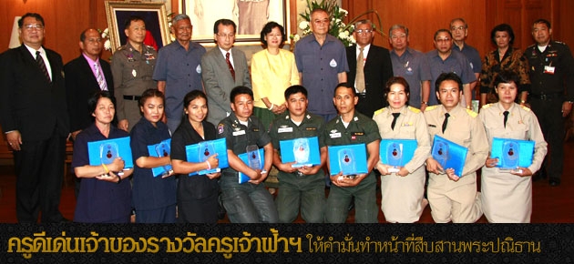 ในปีนี้ครูดีเด่นที่ได้รับการคัดเลือกให้เข้ารับ "รางวัลครูเจ้าฟ้ากรมหลวงนราธิวาสราชนครินทร์" จากท่านผู้หญิงทัศนาวลัย ศรสงคราม พระธิดาในสมเด็จฯกรมหลวงนราธิวาสราชนครินทร์ ณ พระตำหนักวิลล่าวัฒนา เมื่อวันที่ 6 พ.ค.ที่ผ่านมา มีทั้งหมด 9 คน ได้แก่ น.ส.ภัชรินทร์ หน่อแก้ว จากศูนย์การเรียนชุมชนชาวไทยภูเขา "แม่ฟ้าหลวง" บ้านห้วยปูด อ.เฉลิมพระเกียรติ จ.น่าน, น.ส.พิศมัย เหมะธุลิน จากศูนย์การเรียนชุมชนชาวไทยภูเขา "แม่ฟ้าหลวง" บ้านแม่หลองใต้ อ.อมก๋อย จ.เชียงใหม่, น.ส.วราภรณ์ วัฒนะนุกูล ศูนย์ฯ กศน. อ.ธารโต จ.ยะลา, ร.ต.ท.ดอน สมควร โรงเรียนตำรวจตระเวนชายแดนชนัตถ์ปิยะอุย อ.เวียงแก่น จ.เชียงราย, จ.ส.ต.วัชรพงษ์ กันหมุด ศูนย์การเรียนตำรวจตระเวนชายแดน บ้านคะเนจือทะ อ.ท่าสองยาง จ.ตาก, ส.ต.อ.สุวิทย์ ช่วยเทวฤทธิ์ โรงเรียนตำรวจตระเวนชายแดนบ้านละโอ อ.ศรีสาคร จ.นราธิวาส, น.ส.เกษร อินต๊ะทา โรงเรียนบ้านทุ่งหลวง อ.แม่วาง จ.เชียงใหม่, นายบรรเจิด ถาบุญเรือง โรงเรียนอนุบาลปางมะผ้า อ.ปางมะผ้า จ.แม่-ฮ่องสอน และ นางสิริถาวร ดิศรพงศ์ โรงเรียนบ้านสะบารัง อ.เมือง จ.ปัตตานี