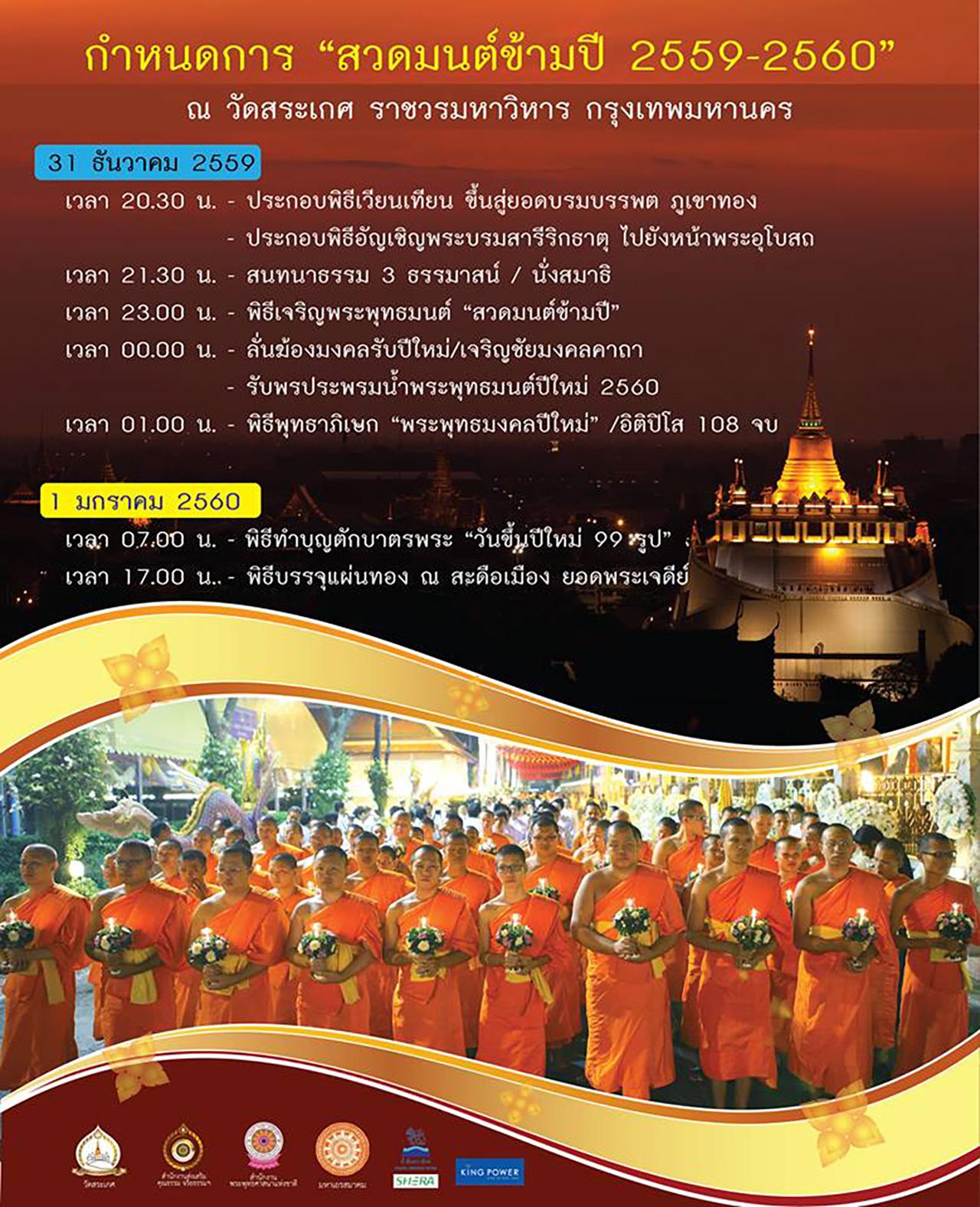 วัดสระเกศราชวรมหาวิหาร เป็นอีกวัดที่จัดกิจกรรมนี้ทุกปี สำหรับปีนี้จะมีการจัดงานในชื่อ “กิจกรรมสวดมนต์ข้ามปี เพื่อน้อมถวายเป็นพระราชกุศลแด่ พระบาทสมเด็จพระปรมินทรมหาภูมิพลอดุลยเดช” ตั้งแต่วันเสาร์ที่ 31 ธันวาคม 2559 เวลา 20.00 น. เป็นต้นไป