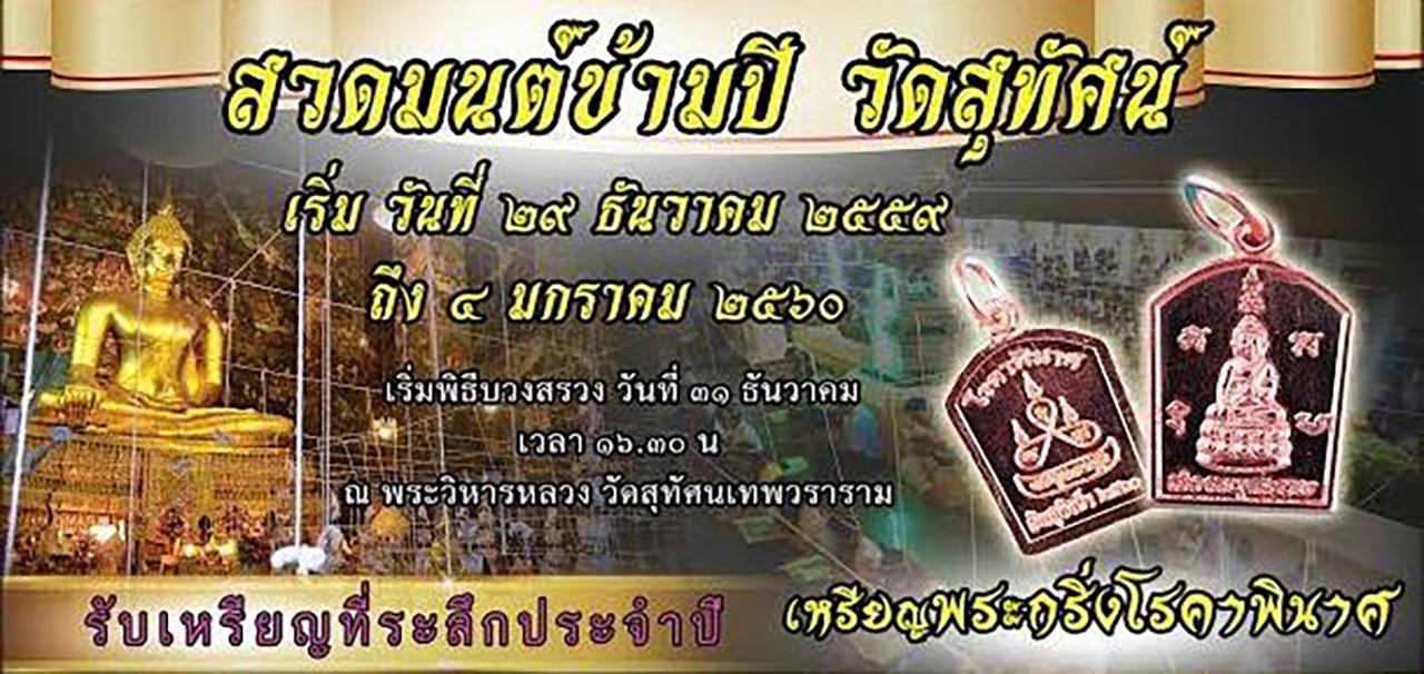 มาถึงวัดดังอีกแห่งที่จัดงานสวดมนต์ข้ามปีอย่างยิ่งใหญ่ นั่นคือ วัดสุทัศนเทพวรารามราชวรมหาวิหาร ชวนคนไทยมาร่วมสวดมนต์ข้ามปีและเป็นเจ้าภาพกิจกรรมงานเทศกาลส่งท้ายปีเก่า-ต้อนรับปีใหม่ ณ พระวิหารหลวง วัดสุทัศนเทพวรารามราชวรมหาวิหาร ตั้งแต่วันที่ 29 ธันวาคม 2559 จนถึง วันที่ 4 มกราคม 2560