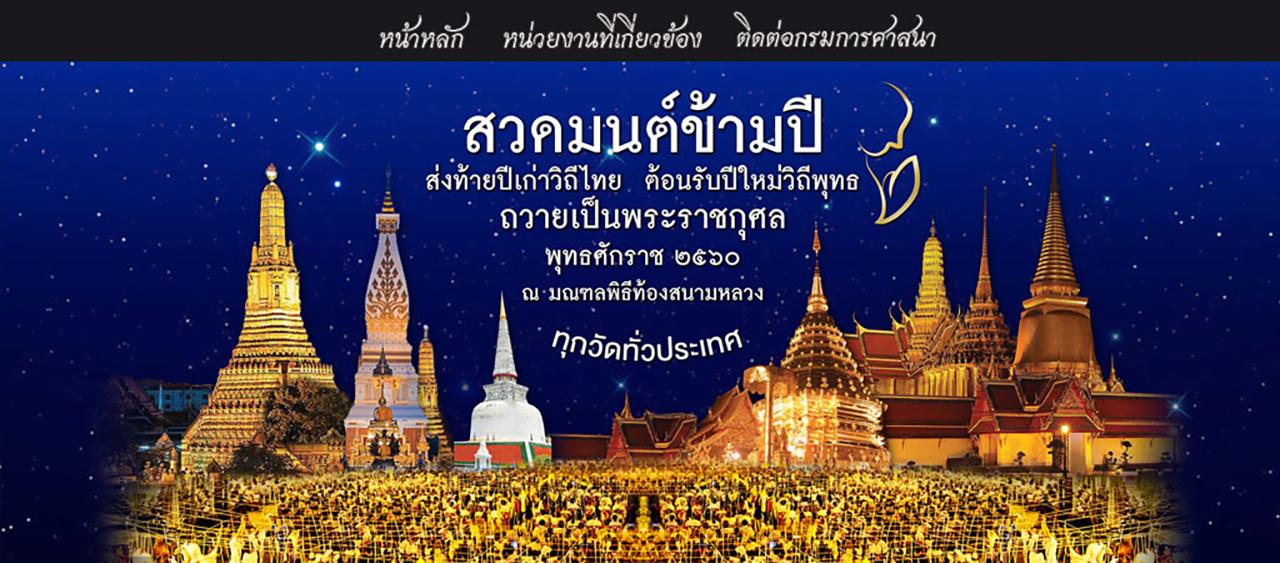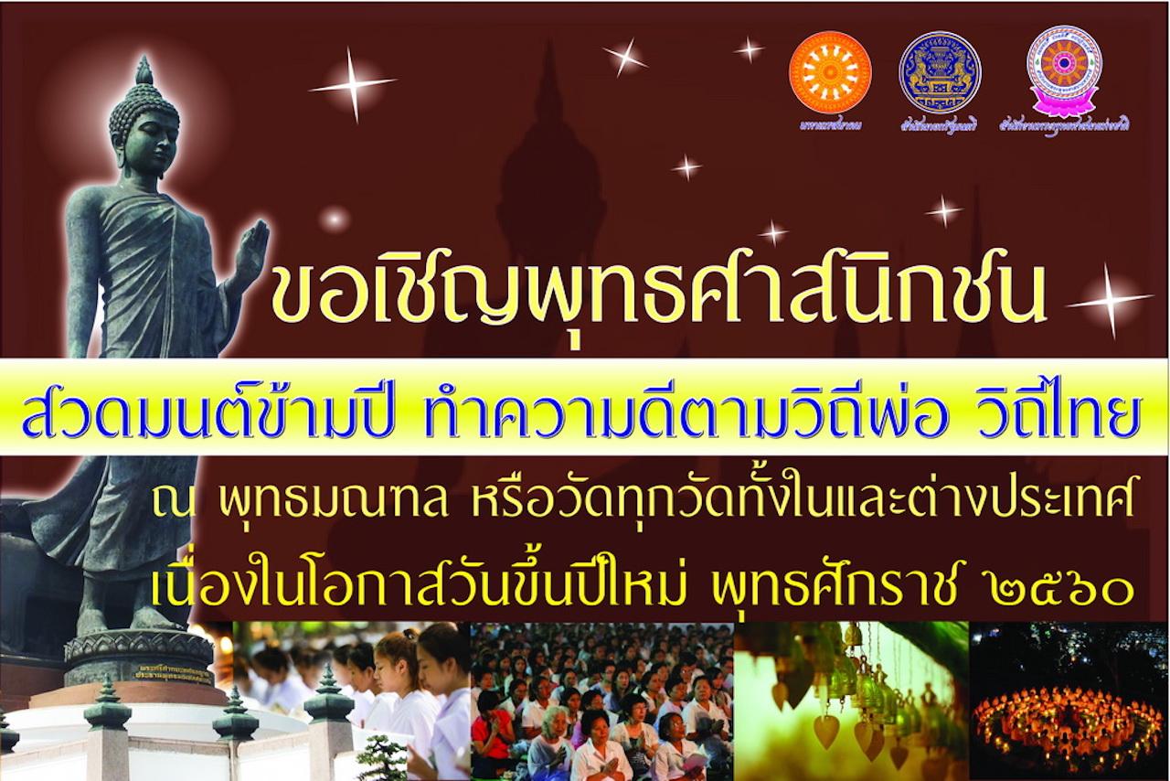 สำนักงานพระพุทธศาสนาแห่งชาติ พุทธมณฑล ขอเชิญชวนพุทธศาสนิกชนสวดมนต์ข้ามปี ภายใต้วลี “สวดมนต์ข้ามปี ทำความดีตามวิถีพ่อ วิถีไทย” และเจริญจิตตภาวนา ในวันที่ 31 ธันวาคม พุทธศักราช 2559 ตั้งแต่เวลา 22.00 น. เป็นต้นไป และในเวลา 00.09 น. เจริญจิตตภาวนาเป็นเวลา 9 นาที เพื่อถวายเป็นพระราชกุศลแด่ พระบาทสมเด็จพระปรมินทรมหาภูมิพลอดุลยเดช