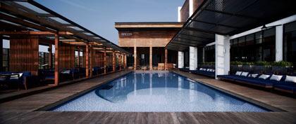 ถัดมาด้านหลังของร้านออกแบบเป็นประตูกระจกบานเฟี้ยมที่เปิดพื้นที่ให้ต่อเนื่องกับโซน Outdoor มีสระว่ายน้ำอยู่ตรงกลาง ขนาบไปด้วยส่วนของเตียงนอนอาบแดด และที่นั่งทานอาหารซึ่งใช้ไม้ระแนงร้อยเรียงกันเป็นซุ้มต่อกันเหมือนกล่อง เรียกได้ว่าได้อิ่มท้องกับการรับประทานอาหารอิตาเลียนรสเลิศ พร้อมๆ ไปกับการได้สัมผัสธรรมชาติ และการออกกำลังกายได้อย่างเต็มที่จริงๆ