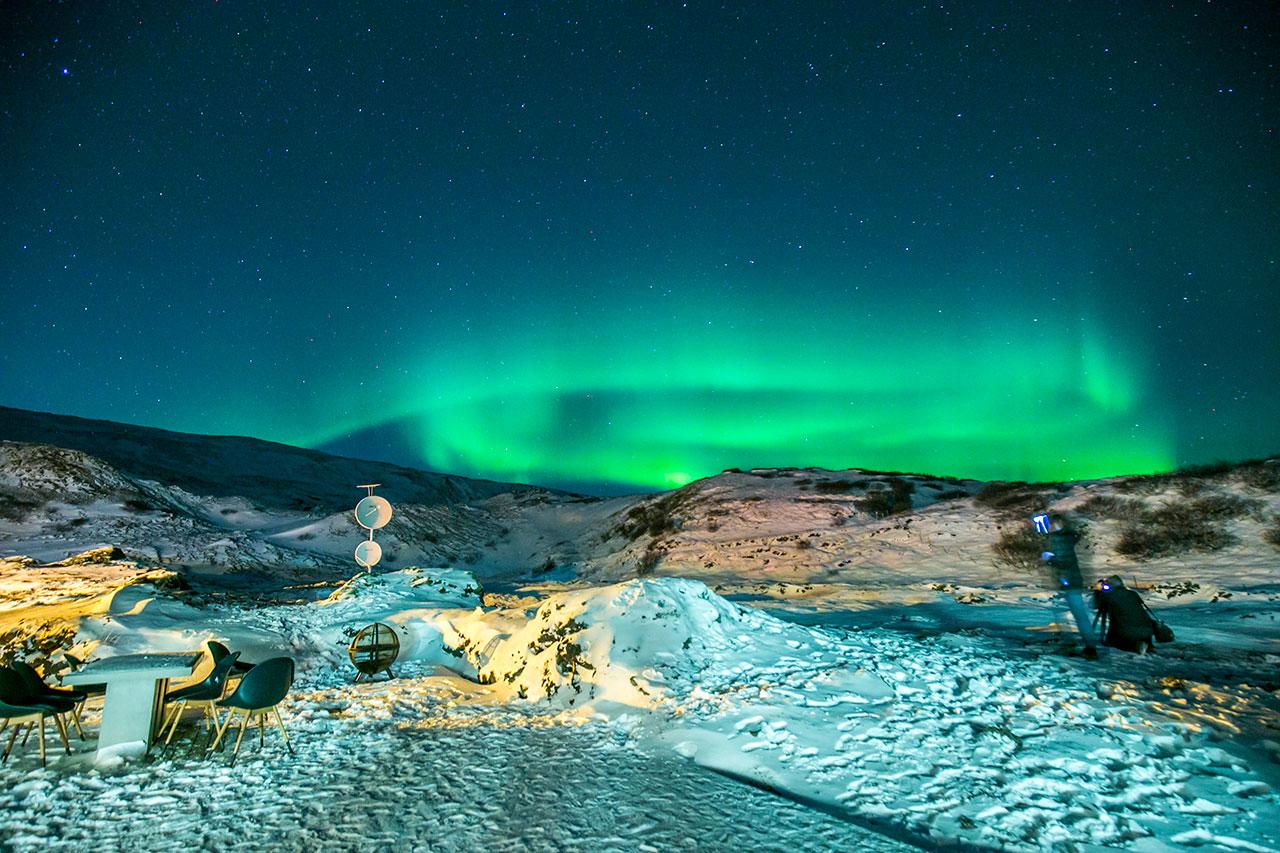 วันออกเดินทาง ความสนุกเริ่มตั้งแต่ขึ้นเครื่อง เพราะไม่มีไฟล์ทบินตรงไปลงไอซ์แลนด์ต้องไปลงที่ประเทศนอร์เวย์ก่อน เราเลยถือโอกาสเที่ยวนอร์เวย์ 2 วัน พอลงเครื่องปุ๊บก็ตรงไปเมือง Nesjaveller เมืองที่ถือว่าเข้าใกล้เขตแสงเหนือแล้ว หัวหน้าทัวร์แนะนำให้เราลงไปซื้อของกินของใช้ที่นี่เลย เพราะถ้าเข้าไปแถวโรงแรมแล้วจะไม่มีร้านค้าให้ได้ซื้อ ที่พักนอกเมืองจะไม่มี 5 ดาว มีแต่ระดับ 3-4 ดาว แต่ก็จัดอยู่ในระดับดีเลยทีเดียว เช็กอินเสร็จ วันแรกทราบจากพนักงานที่เคาน์เตอร์แล้วว่าแสงเหนือน่าจะยังไม่ปรากฏ ในแอปพลิเคชันที่โหลดไว้ก็ไม่ได้แจ้งเตือนเหมือนกัน ทุกคนเลยชิลและพักผ่อนเอาแรงไว้สำหรับการไปเที่ยวในวันรุ่งขึ้น