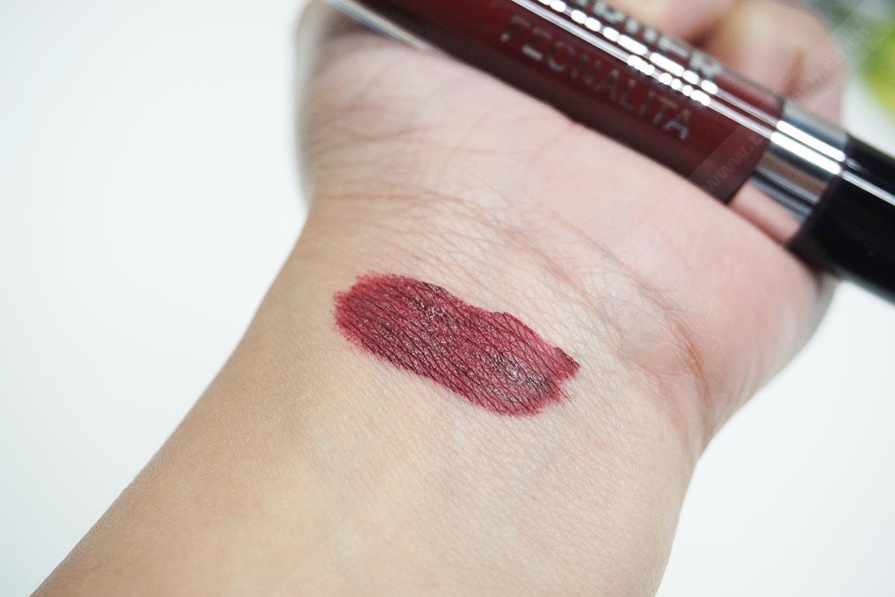 ทดลองใช้ : เนื้อลิปข้นหนืด สีชัดเจน ตัวพู่กันก็ทาง่าย เกลี่ยง่าย แต่เราว่าหลังทาแล้วแห้งช้า และยังมีความเหนอะๆ บนริมฝีปาก เวลาเม้มปากมันจะเหนียวบนปากด้วย ไม่ค่อยชอบตรงนี้ แต่ชอบสี และชอบที่มันติดแน่น ทนนานทั้งวัน กินอะไรก็ไม่เลอะง่าย