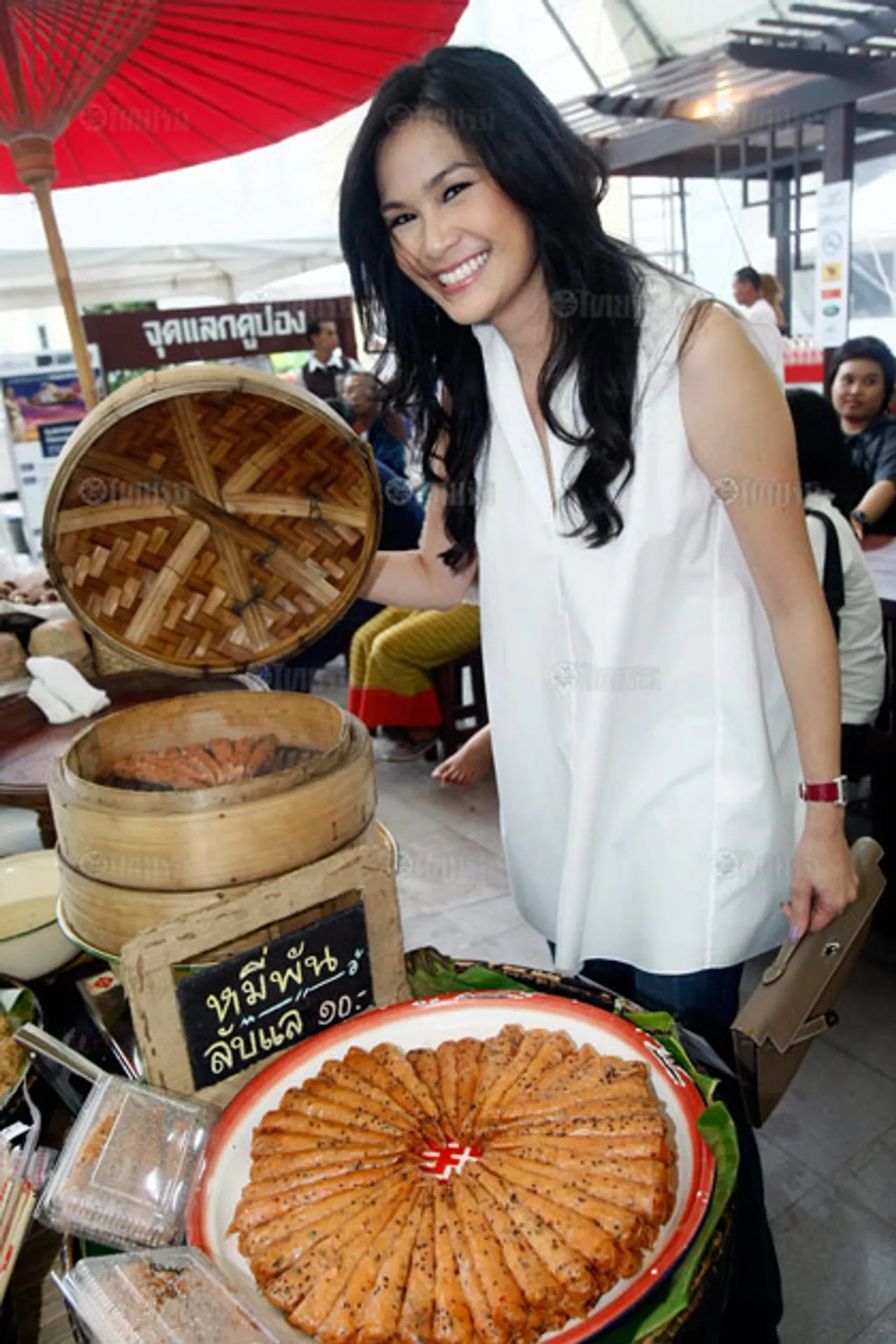 เกรียงศักดิ์ ตันติพิภพ, วรวุฒิ ภิรมย์ภักดี และวันเสด็จ ถาวรสุข ร่วมเปิดงานกับการชิมส้มตำฝีมือ อั้ม–พัชราภา ไชยเชื้อ.