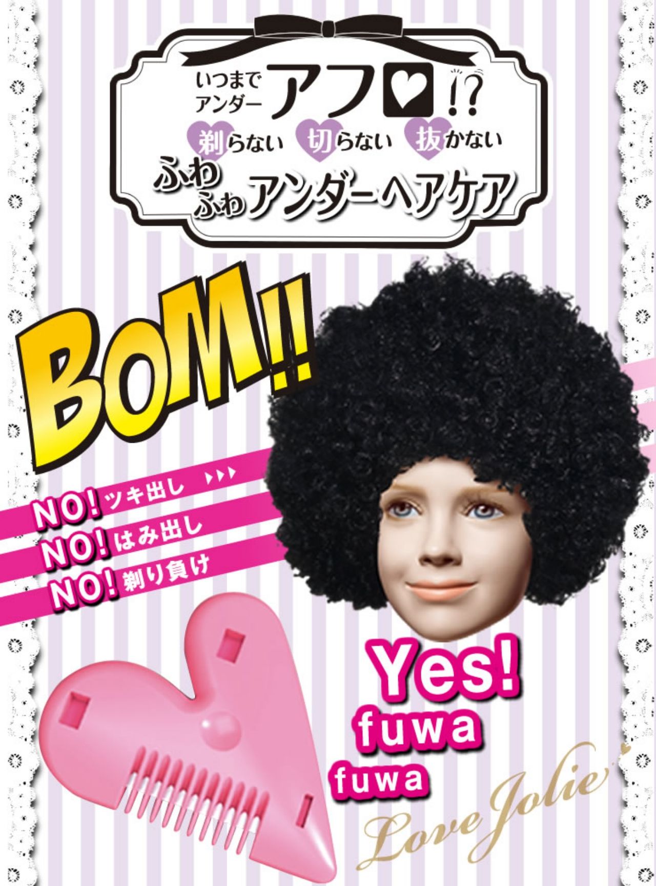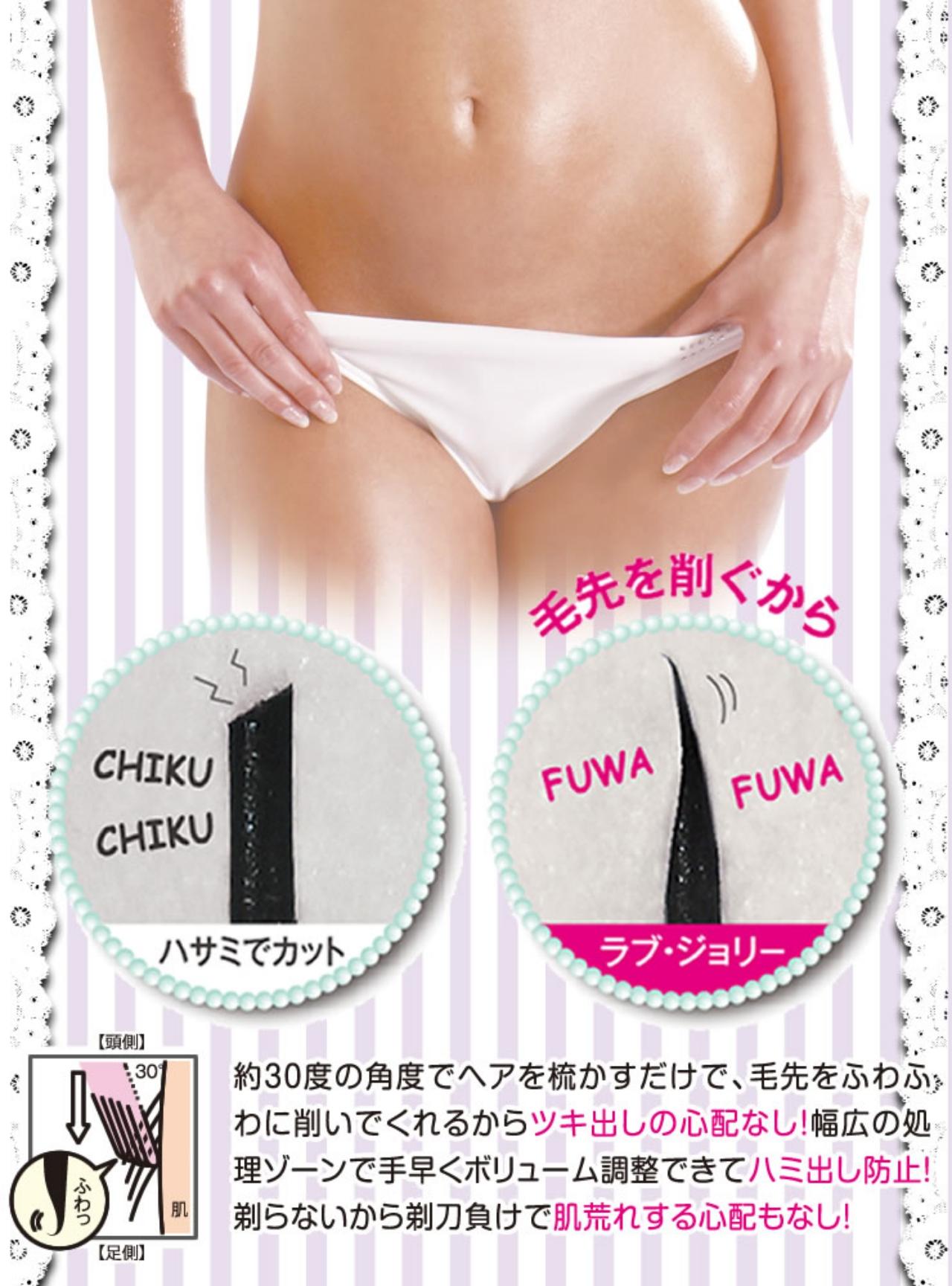 หวีรูปหัวใจสีชมพูน่ารักที่ให้ความแตกต่างจากการใช้กรรไกรในการเล็ม เพราะหวีรูปหัวใจสีชมพูอ่อนนี้ถูกออกแบบมาให้สไลด์ขนแบบเฉียงๆ ทำให้ปลายขนไม่ทิ่มแทงจนสาวๆ รู้สึกคันคะเยอ หรือรู้สึกเจ็บปวดใดๆ ทั้งสิ้น อีกทั้งมุมแหลมของปลายหัวใจยังสามารถตะแคงไปถึงพื้นที่ด้านข้างได้ดีโดยไม่ต้องกลัวว่าจะโดนบาด เนื่องจากใบมีดถูกเก็บไว้อย่างดีด้านใน สไลด์ตรงไหนก็รับรองได้ว่าไม่เป็นแผล ที่สำคัญคือสามารถเปลี่ยนใบมีดได้ ถือว่าลงทุนครั้งเดียวแล้วเก็บไว้ใช้ได้อีกนาน