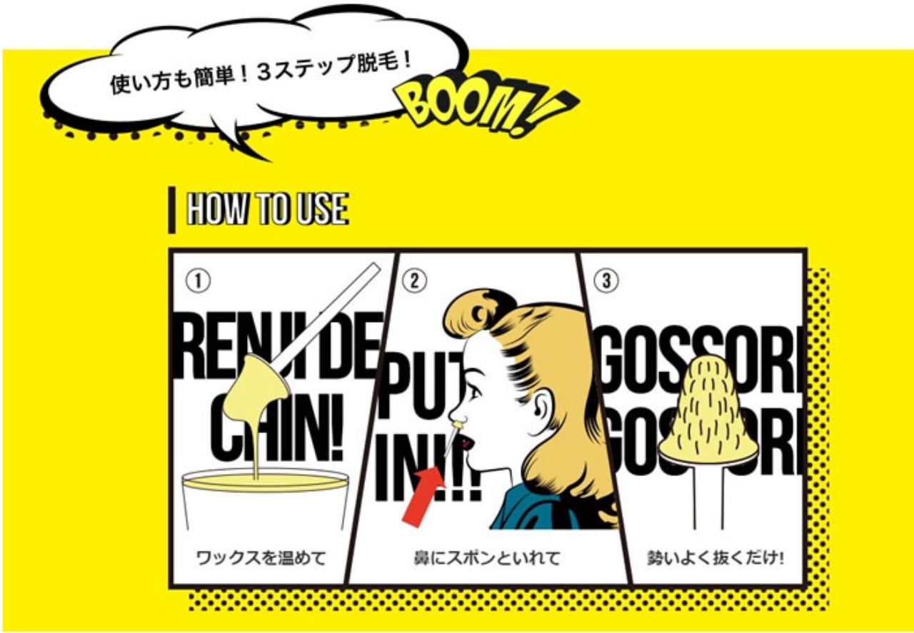 แถมให้...อันนี้ใช้ได้ทั้งผู้หญิง-ผู้ชาย กับที่แว็กซ์ขนจมูกนั่นเอง! ใน 1 กล่องจะมีอุปกรณ์มาให้ครบถ้วน ทั้งแว็กซ์แห้ง ไม้เสียบจมูก แล้วก็ถ้วยกระดาษ เพียงนำแว๊กซ์เม็ดนี้ใส่ถ้วย เข้าไมโครเวฟตามเวลาที่กำหนด แล้วเอาไม้ที่ให้มาด้วยจิ้มให้ได้เนื้อแว็กซ์ขึ้นมา แล้วทิ่มเข้าไปในจมูก รอเวลาให้แห้งซักพัก จากนั้นก็เตรียมใจแล้วดึงออกสุดแรง อึ๊ย!...แค่คิดก็ขนลุกแล้ว ส่วนราคาก็อยู่ที่ 1,944 หรือประมาณ 600 บาท แต่ตอนนี้ยังไม่มีขายในประเทศไทย ใครไปญี่ปุ่นค่อยฝากซื้อก็แล้วกันนะ