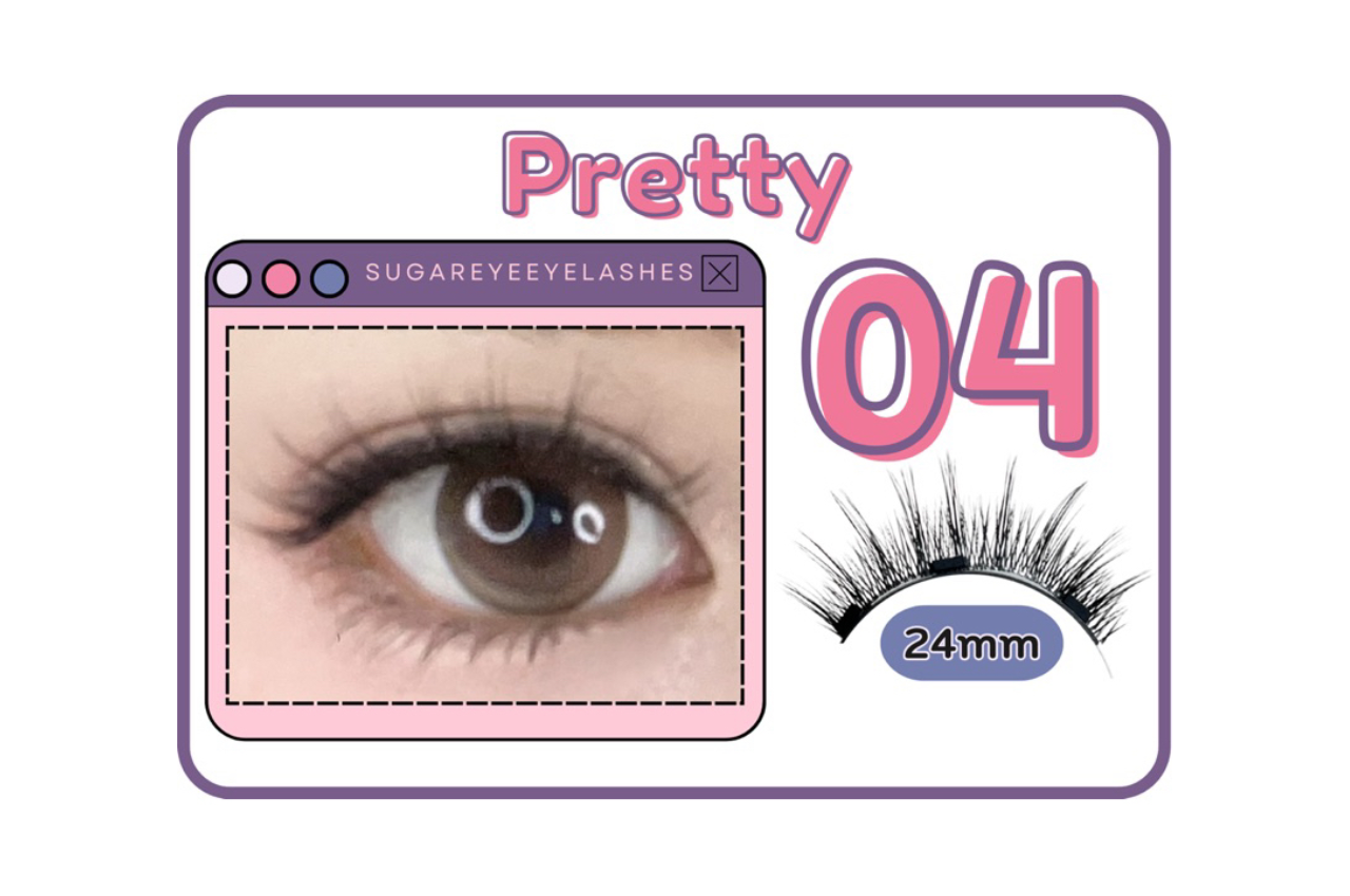 ขนตาแม่เหล็ก Sugareye มาในเบอร์ 04 Pretty ขนตาปลอมที่ช่วยปรับลุคให้ดวงตาดูสดใส สวยน่ารักอย่างเป็นธรรมชาติ ขนตายาวสูงสุดถึง 24 มิลลิเมตร ทำจากวัสดุคุณภาพดี มีน้ำหนักบางเบา เหมาะกับสาวที่มีดวงตาปกติ-ตาโต ทนน้ำ ทนเหงื่อ ไม่ต้องใช้คู่กับอายไลเนอร์ก็สามารถติดได้เลย