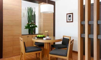 มุม Dinning ขนาดกำลังดี แต่ไม่ทิ้งรายละเอียดของการตกแต่งที่สะท้อนความร่วมสมัยใส่ความเป็นเอเชียน ด้วยงานไม้ที่ผนังกั้นห้อง ซึ่งมีทั้งดีไซน์เป็นช่องสำหรับวางต้นไม้ และรายเรียงเป็นช่องเว้นระยะ เพื่อให้มุมเล็กๆ นี้ไม่คับแคบ