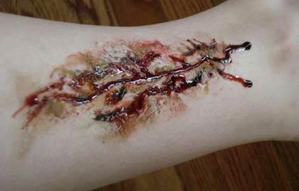 ใส่เจลาตินผสมลงในน้ำเย็น ทิ้งไว้ประมาณ 1 นาที จากนั้นนำไปตั้งบนกระทะไฟอ่อนๆ จนละลาย พอเย็นตัวลง ก็นำมาละเลง หรือตกแต่งบริเวณที่อยากให้เป็นแผนเป็นบางๆ เพิ่มน้ำหนองด้วย corn syrup และตกแต่งรูปร่างตามความต้องการ เติมสีสันด้วยสีผสมอาหารสีแดงให้ดูเป็นแผลสดๆ ก็ได้ และนำไปทาบริเวณรอบๆ แผลปลอม ให้ดูสยดสยองมากขึ้น