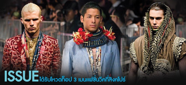 นับเป็น 1 ใน 2 แบรนด์เสื้อผ้าผู้ชายจากประเทศไทยที่ได้รับเชิญให้เข้าร่วม งาน Men’s Fashion Week 2011 in Singapore ซึ่งจัดขึ้นที่ Marina Bay Sands ประเทศสิงคโปร์ เมื่อเร็วๆนี้ สำหรับแบรนด์ ISSUE โดย ISSUE ได้สร้างความตื่นตาตื่นใจให้กับเหล่าแฟชั่นนิสต้า ด้วยการนำแรงบันดาลใจจากบทประพันธ์เรื่องลิลิตตะเลงพ่าย ซึ่งเป็นเรื่องราวของนักรบไทยโบราณ มาตกแต่งรันแวย์ความยาวกว่า 200 เมตรให้เป็น“ลายสักยันต์เสือเผ่น”โดยนำเมล็ดข้าวสารสีขาวและสี ดำมาเรียงจนกลายเป็นลายสักยันต์เสือเผ่นและหลังโชว์จบลง ข้าวสารทั้งหมด 5,000 กิโลกรัม ยังได้ถูกส่งต่อไปช่วยเหลือผู้ประสบภัยสึนามิที่ประเทศญี่ปุ่น ซึ่งนับเป็นโชว์ที่ได้รับการตอบรับจากผู้ชมอย่างล้นหลาม จนได้รับการโหวตให้เป็นท็อป 3 ของ Men’s Fashion Week 2011 in Singapore และยังได้รับการยอมรับจากบล็อกเกอร์ชื่อดังอย่าง Byranboy ว่าเป็นโชว์ที่ดีที่สุดในงานครั้งนี้อีกด้วย.