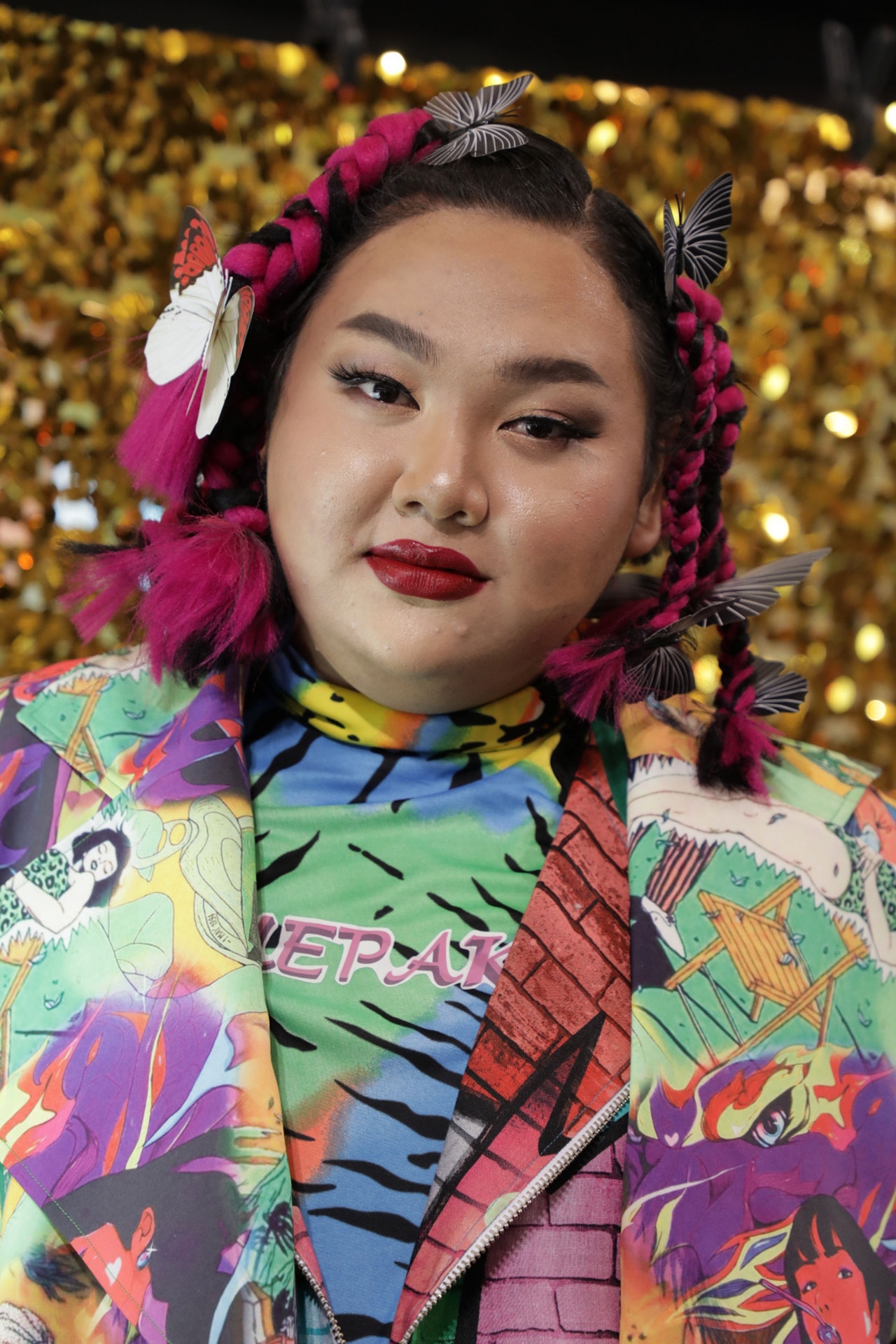 ในส่วนของ “เอแคลร์ จือปาก” ขอแนะนำการแต่งหน้า แบบมีสีสันคมเข้มจัดจ้านเล็กๆ สไตล์จือปากให้สาวๆ ได้สวยแบบง่ายๆ ก่อนอื่นเริ่มต้นด้วยการเช็ดผิวเตรียมผิวด้วย Kiehl’s Calendula Toner ต่อด้วย Estee Lauder Advanced Night Repair Serum ทาให้ทั่วผิวหน้า ไม่ต้องใช้เยอะมากเพราะเข้มข้นมาก ทิ้งไว้สักครู่แล้วต่อด้วยเบส ETUDE Blossom Satin Finish Base Pink บริเวณหน้าแก้มเพื่อเตรียมผิว ตามด้วยคุชชั่นสุดปังแห่งปีอย่าง JUNG SAEM MOOL Essential Nuder Cushion ค่อยๆ แท็บเบาๆ ให้ทั่วใบหน้าให้ผิวกระจ่างใส ปกปิดริ้วรอยช่วยให้เมคอัพติดทนนาน ผิวเรียบเนียนดูฉ่ำวาว เมื่อเตรียมหน้าพร้อมแล้วได้เวลาเปิดพาเล็ตต์มหัศจรรย์ SEPHORA Collection Wild Days Eyes and Face Palette พาเล็ตต์สำหรับแต่งหน้าที่มีครบครันทั้งอายแชโดว์ บลัชออน ในเฉดสีกุหลาบ เบจ และคอปเปอร์ เพื่อให้สนุกสนานกับการเบลนด์สีได้ตามใจจนกลายเป็นลุคเฉพาะของตัวเอง เลือกลงสีธรรมชาติที่เราชอบลงที่เปลือกตาก่อนค่อยๆ เบลนด์เปลือกตาให้กลมกลืนเป็นสีเบส หรือถ้านึกสีอะไรไม่ออกให้เลือกพวกชิมเมอร์สีเดียวจบ