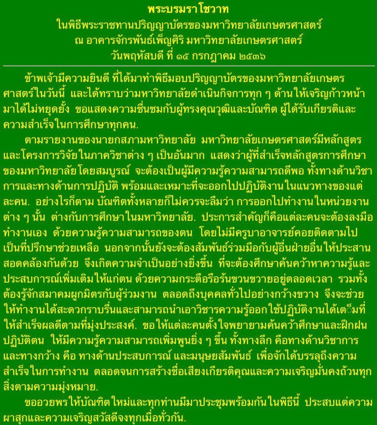 อาจารย์โชคดีในวันนั้นเป็นนิสิตเกษตรฯคนหนึ่งที่ในวันพิธีพระราชทานปริญญาบัตร อาจารย์อยู่ข้างหน้า ด้วยชื่อของเรา เขมชาติ ข.ไข่ ทำให้อาจารย์ได้ฟังพระราชดำรัสชัดๆ อย่างตั้งใจ และคุณแม่กับคุณยายสอนเลยว่าเป็นวันที่ถือว่ามีบุญที่สุด ถ้าเราไม่ได้รับงานราชการหรืองานถวาย โอกาสจะได้มาใกล้ชิดพระองค์แบบนี้ก็แทบจะไม่มีเลย นอกจากในวันรับปริญญานี้แหละก็คือที่สุดของชีวิตแล้ว