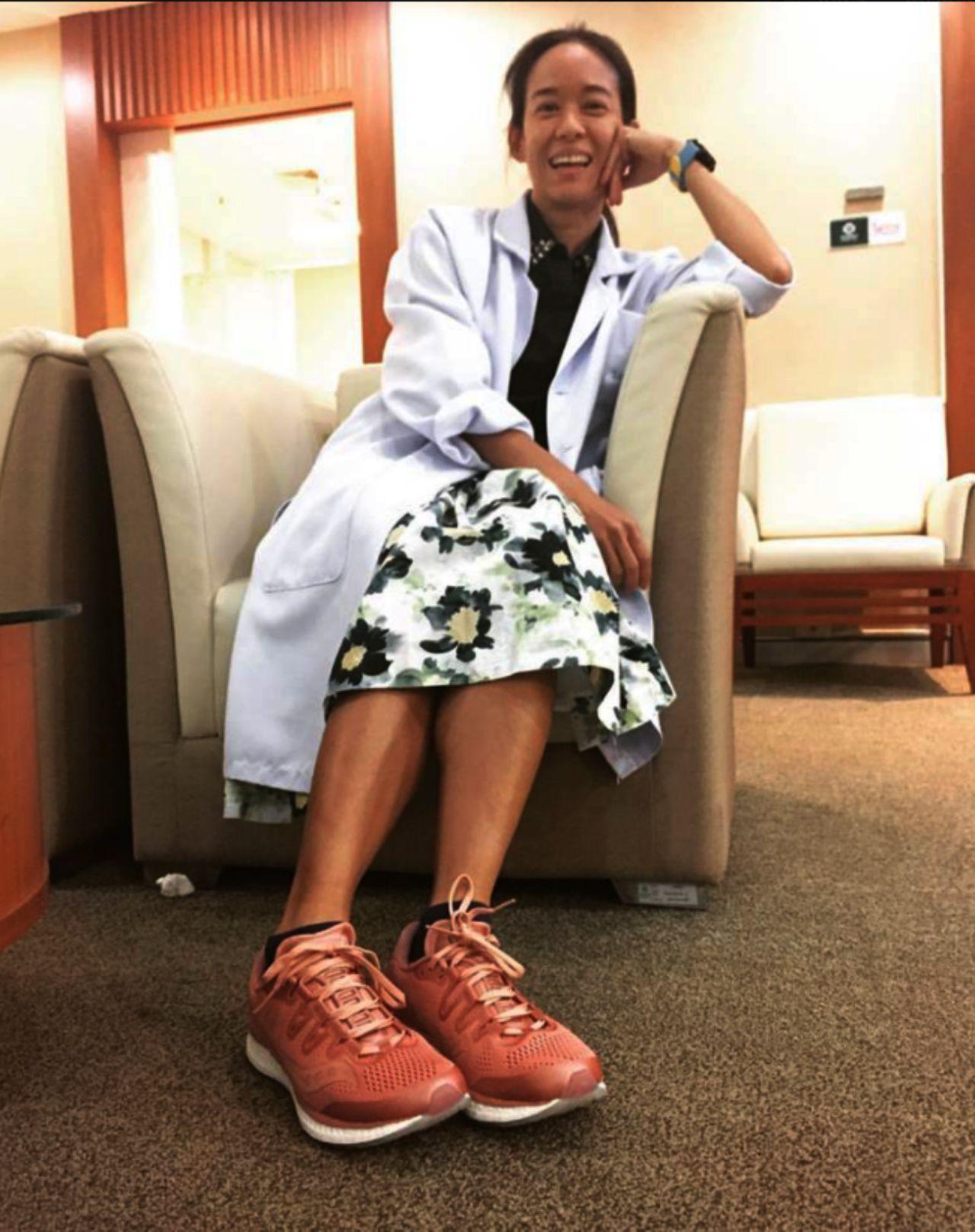 7. แต่งานหลักของหมอเมย์ก็ไม่ได้ทิ้ง นั่นคือการรักษาคนไข้เกี่ยวกับกล้ามเนื้อ โรคออฟฟิศซินโดรม ทำกายภาพบำบัดต่างๆ พอได้เริ่มมาวิ่ง ก็เริ่มรู้ถึงปัญหา เข้าถึงอาการที่นักวิ่งประสบพบเจอแตกต่างกันไปในแต่ละกรณี แล้วเรามีองค์ความรู้เกี่ยวกับเวชศาสตร์ฟื้นฟูก็เริ่มเอามาใช้กับตัวเองก่อน แล้วก็เอามารักษาคนไข้ได้อย่างเข้าใจ วินิจฉัยได้ตรงมากขึ้น ซึ่งตอนนี้จากคนไข้ทั้งหมด กว่า 80% เป็นผู้ที่ออกกำลังกายด้วยการวิ่งทั้งนั้น