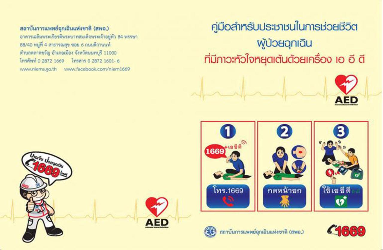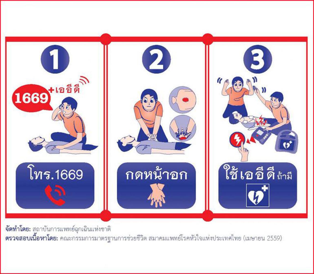 3. โทร. 1669 เพื่อขอความช่วยเหลือจากเจ้าหน้าที่ พร้อมกับนำเครื่อง AED มา