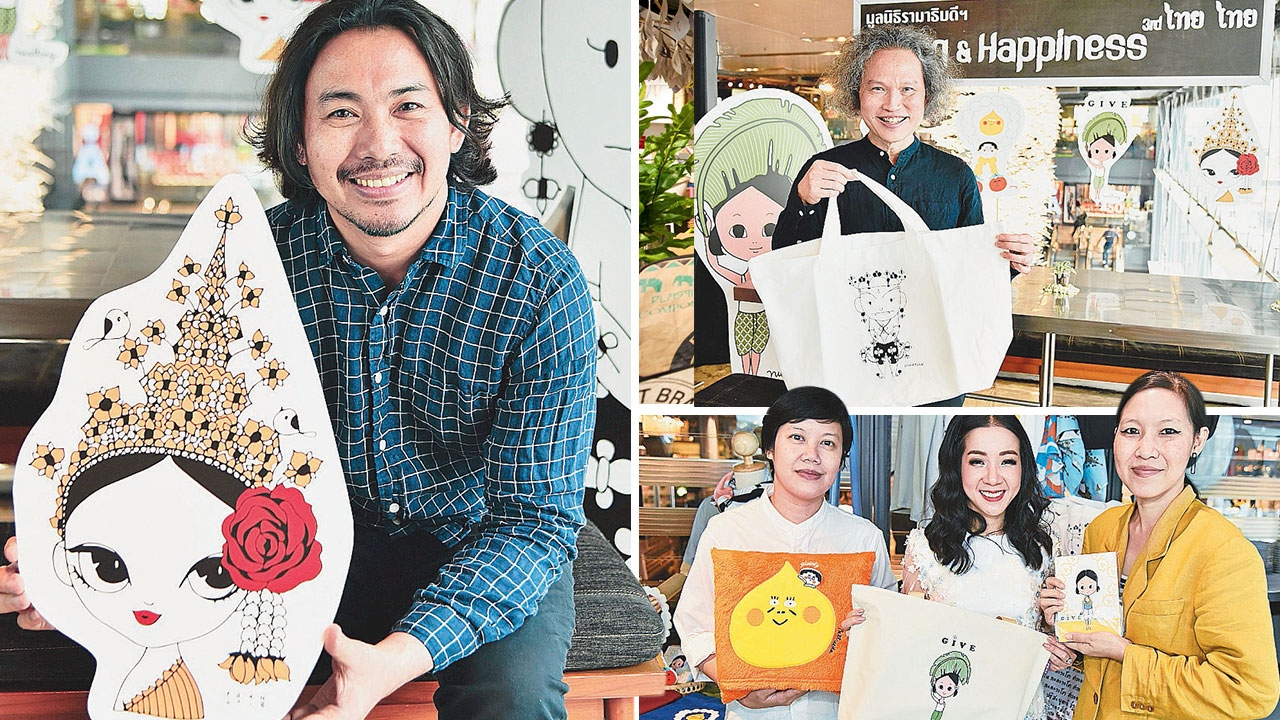 หนึ่งในศิลปินที่ร่วมสร้างสรรค์คอลเลกชัน “ไทย ไทย” อาทิ ครูโต–ม.ล.จิราธร เล่าถึงแรงบันดาลใจในการนำความเป็นไทยมานำเสนออย่างร่วมสมัยว่า เลือกนำคาแรกเตอร์ของ “ยักษ์” ที่ไม่เพียง สะท้อนถึงความยิ่งใหญ่ และความ แข็งแรง เสมือนเป็นตัวแทนผู้ที่จะคอยดูแลปกปักรักษาพวกเราทุกคน แต่ยังเป็นสิ่งที่คนไทยทุกคนคุ้นเคยด้วย เลยตัดสินใจนำมาถ่ายทอดเป็นลายเส้น ที่มีเอกลักษณ์เฉพาะ ดูเรียบง่ายและสบายตา โดยคุมโทนให้เป็นแนวขาว-ดำ ด้าน ครูปาน–สมนึก ได้เลือกออกแบบลายเส้น เป็นรูปหญิงไทยสวมชฎาทัดกุหลาบดอกใหญ่สีแดงสด ซึ่งได้แรงบันดาลใจ จากภาพวาดนางชฎาของตนเอง ที่เคยจัดแสดงที่นิวยอร์กและได้รับความสนใจอย่างมาก อีกทั้งคนที่จะเป็นนางฟ้าต้องเป็นผู้ให้ จึงอยากให้ทุกคนมองว่า แม้จะเป็นการให้เพียงเล็กน้อยก็อย่าเพิกเฉย เพราะ การให้ คือการทำบุญอย่างหนึ่ง ค่อยๆทำ ค่อยๆสะสมก็เป็นสิ่งยิ่งใหญ่ได้