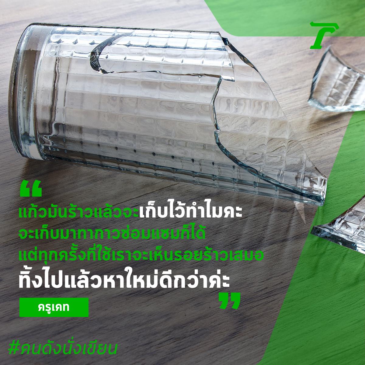 เอาเวลาเศร้าไปทำอะไรให้มีความสุขดีกว่านะคะ แก้วมันร้าวแล้วจะเก็บไว้ทำไมคะ จะเก็บมาทากาวซ่อมแซมก็ได้ แต่ทุกครั้งที่ใช้เราจะเห็นรอยร้าวเสมอ ทิ้งไปแล้วหาใหม่ดีกว่าค่ะ