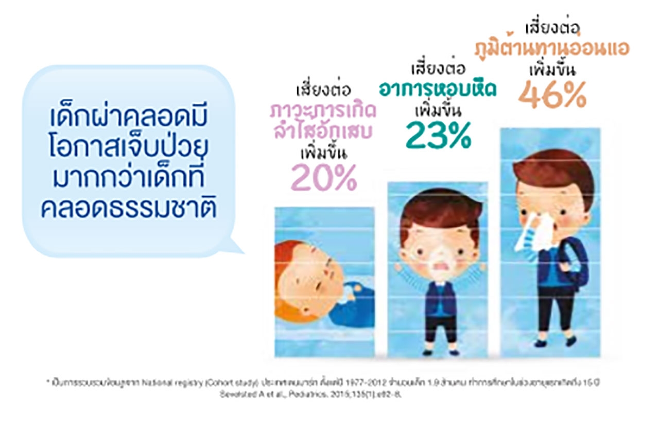 พัฒนาการของลูกนั้นเริ่มตั้งแต่อยู่ในท้อง และต่อเนื่องมาจนถึงช่วงแรกเกิดทารกจนถึงวัยเด็ก การที่จะเติบโตแข็งแรงนั้น จำเป็นต้องได้รับภูมิต้านทานและสารอาหารต่างๆ ที่เหมาะสม แต่สาเหตุที่เด็กผ่าคลอดมีภูมิต้านทานตั้งต้นน้อยกว่าเด็กคลอดธรรมชาติ เพราะเด็กจะไม่ได้รับจุลินทรีย์สุขภาพผ่านช่องคลอดแม่ ซึ่งจุลินทรีย์สุขภาพในลำไส้นี้ส่งผลกับพัฒนาการด้านภูมิต้านทานในช่วงแรกของชีวิต จากผลการวิจัย National Registry ของเดนมาร์ก ปี 1977-2012 จำนวนเด็ก 1.9 ล้านคน ติดตามเด็กแรกเกิดไปจนถึงอายุ 15 ปี พบว่าเด็กผ่าคลอดมีความเสี่ยงต่อการมีภูมิต้านทานตั้งต้นอ่อนแอเพิ่มขึ้นถึง 46% เสี่ยงต่ออาการหอบหืดเพิ่มขึ้นถึง 23% และเสี่ยงต่อโรคลำไส้อักเสบเพิ่มขึ้นถึง 20%