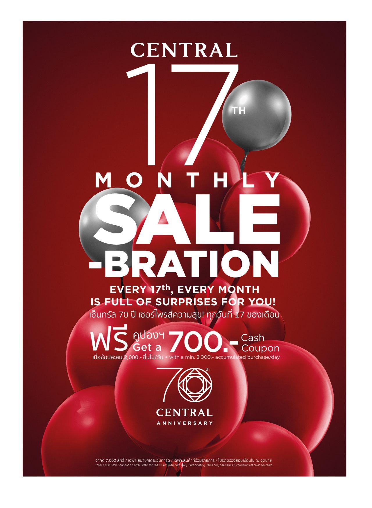 ห้างเซ็นทรัลเซอร์ไพรส์ความสุขสุดพิเศษสำหรับลูกค้า จัดรายการ “Central 17th Monthly Salebration (17 Jul’17)” (เซ็นทรัล มันท์ลี่ เซเลเบรชั่น ประจำวันที่ 17 ก.ค.) ฉลองครบ “70 ปี ห้างเซ็นทรัล” ลูกค้า The 1 Card (เดอะ วัน คาร์ด) ทุกวันที่ 17 ของเดือน
