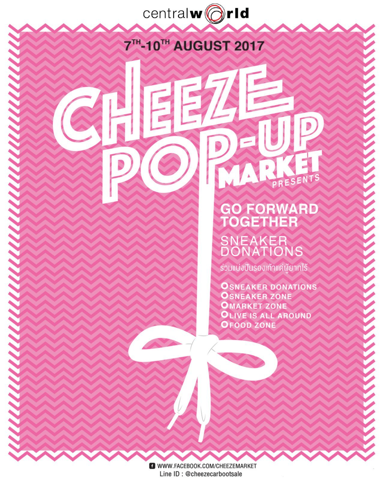 ภายในแบ่งออกเป็น 4 โซนใหญ่ๆ ไม่ว่าจะเป็น MARKET ZONE ที่ยังคงมีร้านค้าน่าช็อปมากมายเหมือนเดิม เพิ่มเติมคือโซนร้านค้า SNEAKER เอาใจสาวก ด้วยแบรนด์รองเท้าชั้นนำมากมาย และที่ขาดไปไม่ได้ FOOD ZONE ขนความอร่อยมาถึงที่ จัดเต็มด้วยอาหารและเครื่องดื่มที่หลากหลายมาบริการทุกคนเหมือนเคย สุนทรีย์ไปกับวงดนตรีที่จะมาเล่นกันสดๆ ทั้งงานกับ LIVE IS ALL AROUND และปิดท้ายด้วยพระเอกของงานอย่าง DONATION - EXHIBITION จุดรับบริจาครองเท้าสุดสร้างสรรค์ ที่เราได้เนรมิต INSTALLATION - EXHIBITION จัดวางกล่องรองเท้าเป็นรูปรองเท้า ที่สำคัญไม่จำกัดประเภทของรองเท้าในการรับบริจาค และแน่นอนว่าบรรดาพ่อค้าแม่ค้าใจดี รวมถึงกลุ่มคนในแวดวงการ หลากหลายสไตล์ อาชีพ และความชอบ ก็จะมารวมตัวเพื่อแบ่งปันสิ่งของ เพื่อส่งต่อให้กับเด็กๆ ที่ขาดโอกาสเช่นกัน โดยรองเท้าทุกคู่จะถูกส่งต่อไปที่มูลนิธิยุวพัฒน์ (ร้านปันกัน) เพื่อดำเนินงานการบริจาคต่อไป