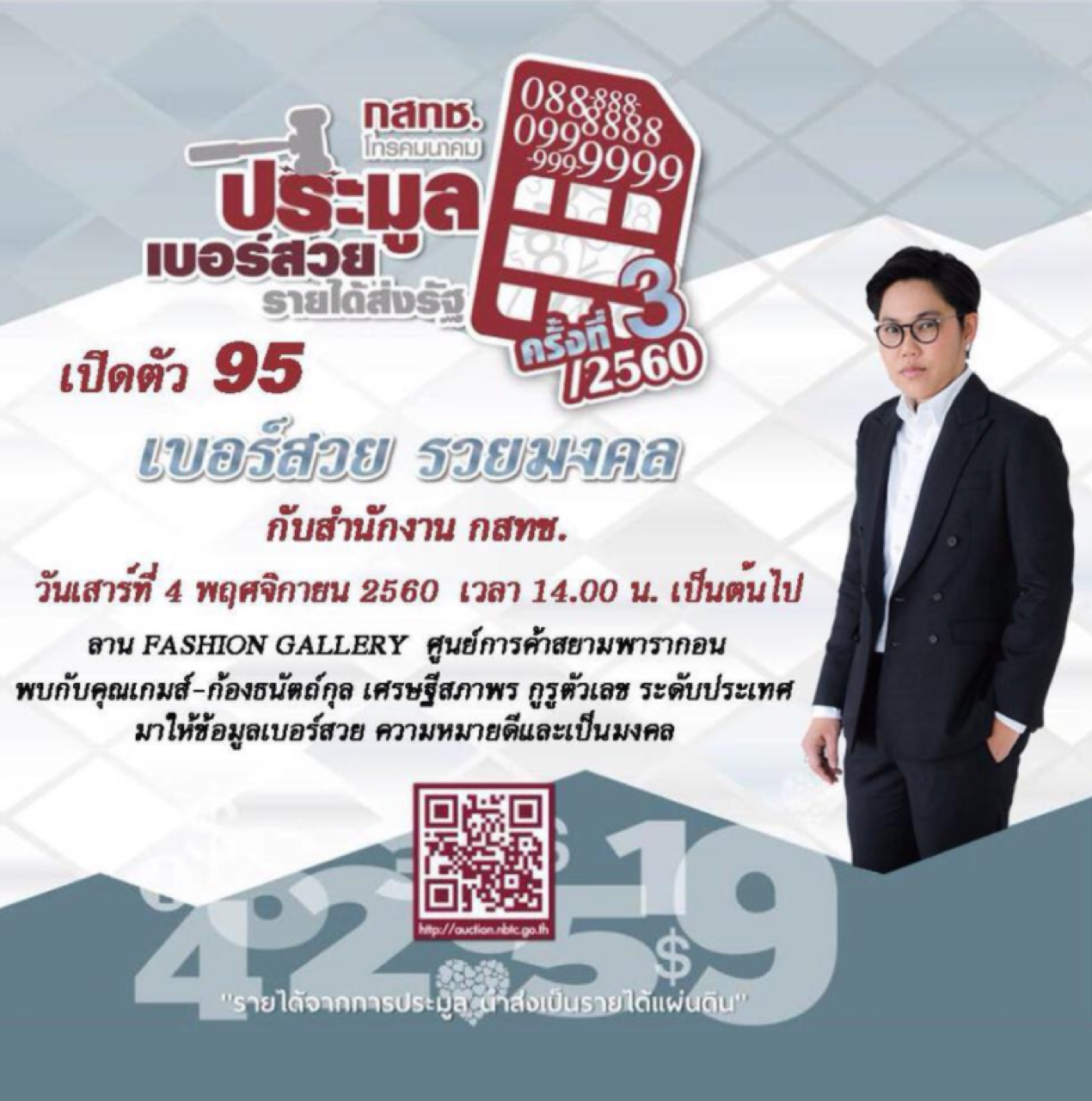 กสทช.โทรคมนาคม ประมูลเบอร์สวย รายได้ส่งรัฐ โดย แถลงข่าว วันเสาร์ที่ 4 พ.ย. เวลา 14.00 น. ณ ลาน FASHION GALLERY ศูนย์การค้าสยามพารากอน ท่านผู้ลงทะเบียน 5 ท่านแรก เวลา 13.00 น. สามารถรับบัตรคิว ตรวจเบอร์กับคุณเกมส์กูรูตัวเลขคนดังตัวจริงได้เลยครับ. #ประมูลจริงวันที่ 26 พ.ย.ณ ตึก กสทช. อยากรู้ว่ากูรูเกมส์ คือใคร เจ๋งอย่างไร อ่านได้ที่ เปิดโฉมหน้า GAME9999 'นักวางเบอร์โทร' เงินล้าน!