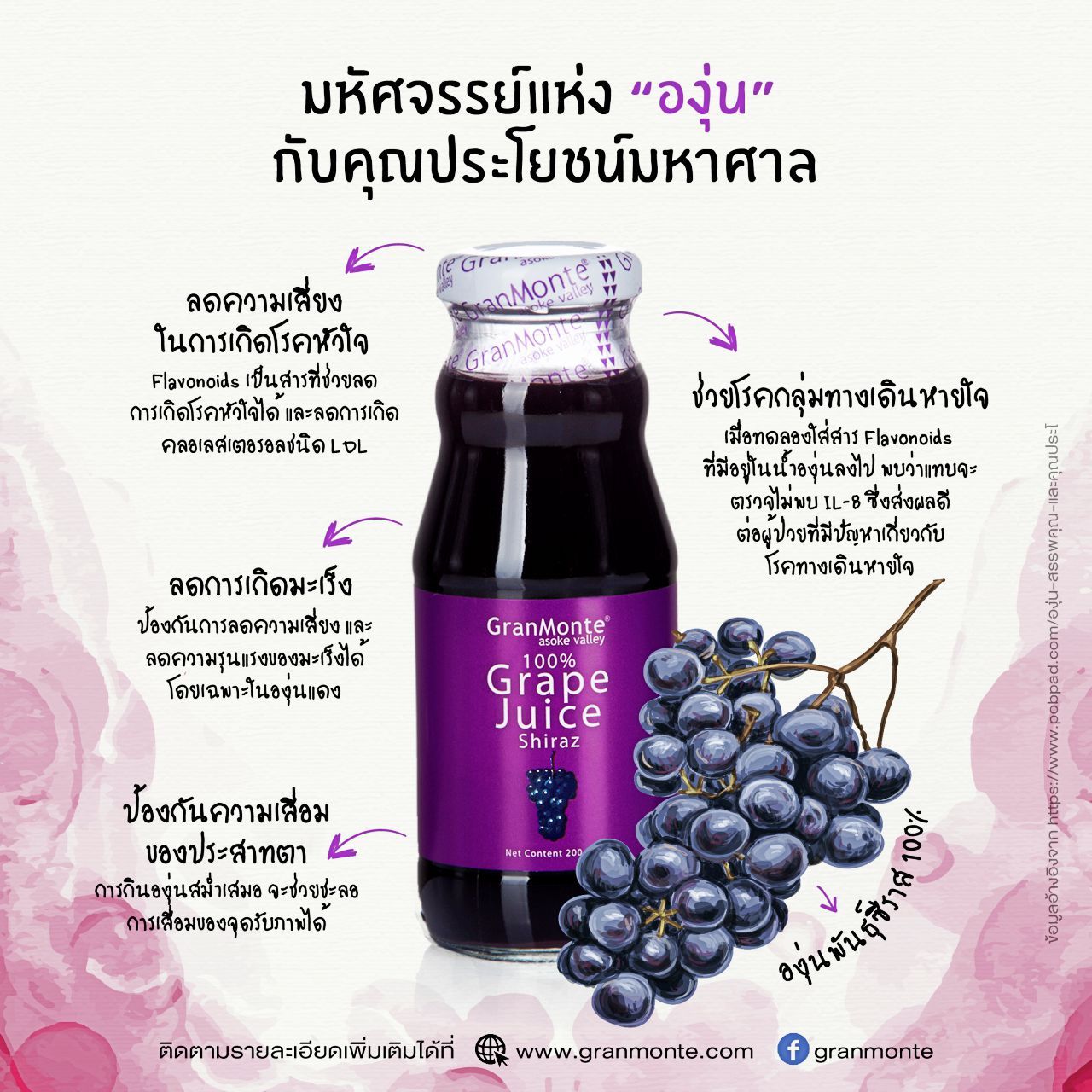 ส่วนใครที่อยากลองดื่มน้ำองุ่นเกรดพรีเมียม สามารถซื้อได้ที่ไร่ หรือสั่งซื้อได้ทางออนไลน์ รวมถึงซุปเปอร์มาร์เก็ตในห้างสรรพสินค้าชั้นนำ ติดตามรายละเอียดเพิ่มเติมได้ที่ www.granmonte.com