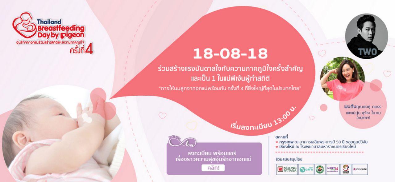 บริษัท มุ่งพัฒนา อินเตอร์แนชชั่นแนล จำกัด (มหาชน) ผู้ผลิตและจัดจำหน่ายผลิตภัณฑ์สำหรับแม่และเด็กแบรนด์ “พีเจ้น” เชิญชวนคุณแม่ที่กำลังอยู่ในช่วงให้นมบุตร สร้างสถิติให้นมลูกจากอกแม่พร้อมกัน ครั้งยิ่งใหญ่ที่สุดในประเทศไทย ในงาน "Thailand Breastfeeding Day By Pigeon" อุ่นรักจากอกแม่ร่วมสร้างสถิติแห่งความภาคภูมิใจ ครั้งที่ 4 เพื่อเป็นแรงบันดาลใจ และเป็นส่วนหนึ่งในการรณรงค์การเลี้ยงลูกด้วยนมแม่ร่วมกัน บันทึกใน Thailand Records ภายในงานพบแขกรับเชิญสุดพิเศษ “ตู่-ภพธร สุนทรญาณกิจ และ นุ้ย-สุจิรา อรุณพิพัฒน์” พร้อมด้วยเหล่าคุณแม่เซเลบ และคุณแม่ต้นแบบพีเจ้นที่มาร่วมแชร์หลากหลายประสบการณ์ในการเลี้ยงลูกด้วยนมแม่ร่วมกัน