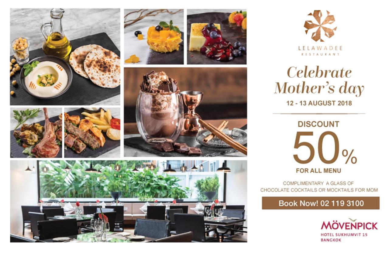 วันที่ 12-13 สิงหาคม 2561 ชวนพาคุณแม่ไปอิ่มอร่อย ด้วยโปรโมชั่นสุดพิเศษกับส่วนลดถึง 50% เมื่อทานอาหาร ณ ห้องอาหารลีลาวดี โรงแรมเมอเวนพิค สุขุมวิท15 กรุงเทพ เริ่มบริการตั้งแต่เวลา 11.00 น. เป็นต้นไป และพิเศษ สุดสำหรับคุณแม่ที่มารับประทานอาหาร จะได้รับเครื่องดื่มช็อคโกแลตซิกเนเจอร์ม็อกเทล หรือ ค็อกเทล ซึ่งใช้ช็อคโกแลตแท้นำเข้าจากประเทศสวิตเซอร์แลนด์ ฟรีทันที 1 แก้วต่อ 1 โต๊ะ สำรองที่นั่งได้ที่ 0 2119 3100