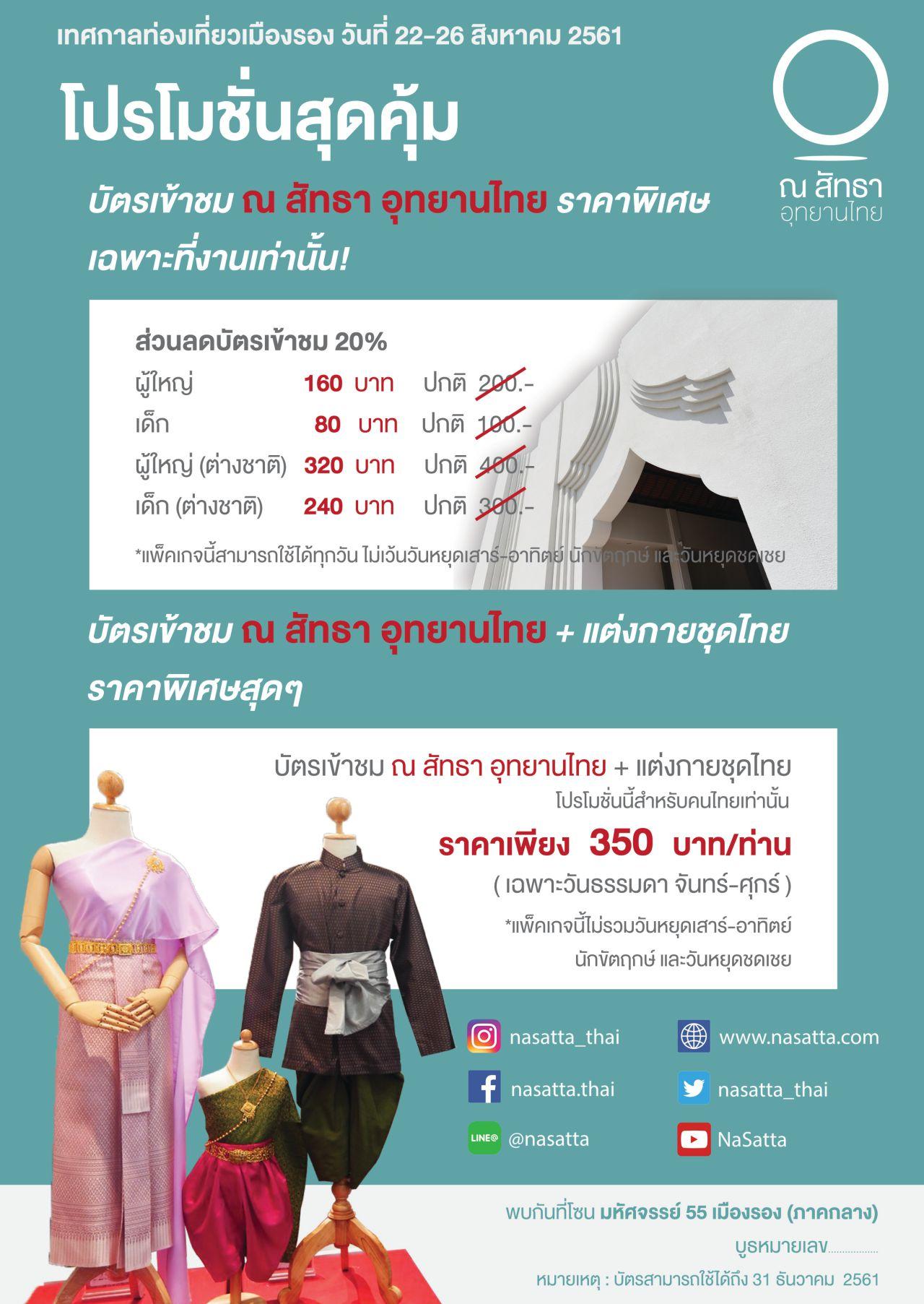 ณ สัทธา อุทยานไทย สถานที่ท่องเที่ยวแห่งใหม่ อุทยานแห่งการเรียนรู้และอนุรักษ์วัฒนธรรมไทย จังหวัดราชบุรี ร่วมสนับสนุนกิจกรรมส่งเสริมการท่องเที่ยวกับการท่องเที่ยวแห่งประเทศไทย (ททท.) ขอเชิญประชาชนร่วมงาน "เทศกาลท่องเที่ยวเมืองรอง : มหัศจรรย์ 55 เมืองรอง ลองไปแล้วจะรู้" ระหว่างวันที่ 22-26 สิงหาคมนี้ ณ ศูนย์ประชุมแห่งชาติสิริกิติ์ ซึ่งภายในงาน ณ สัทธา อุทยานไทย จัดโปรโมชั่นสำหรับนักท่องเที่ยวที่เข้าเยี่ยมชมบูธ อาทิ ซื้อบัตรเข้าชม ณ สัทธา อุทยานไทย จ.ราชบุรี รับส่วนลด 20% ทันที หรือแพ็กเกจสุดคุ้ม เมื่อซื้อบัตรเข้าชม ณ สัทธา อุทยานไทย จ.ราชบุรี พร้อมชุดไทยสำหรับใส่เดินชมภายในอุทยาน (ชายหรือหญิง) จำนวน 1 ชุด ในราคา 350 บาท (จากราคาปกติ 450 บาท)