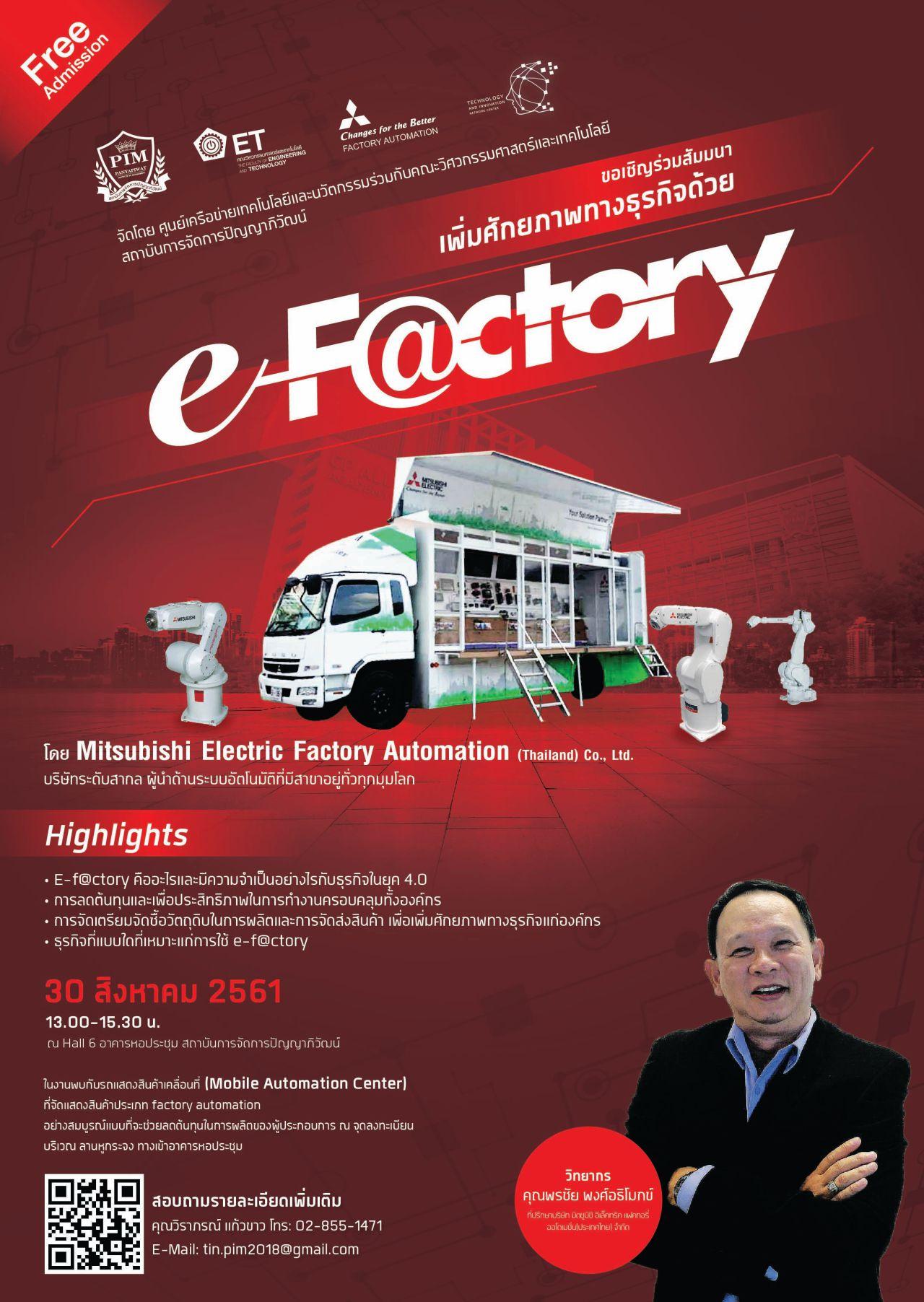 ศูนย์เครือข่ายเทคโนโลยีและนวัตกรรม ร่วมกับคณะวิศวกรรมศาสตร์และเทคโนโลยี สถาบันการจัดการปัญญาภิวัฒน์ (พีไอเอ็ม) ขอเรียนเชิญเข้าร่วมงานสัมมนาบริการวิชาการ ภายใต้หัวข้อ “เพิ่มศักยภาพทางธุรกิจด้วย e-f@ctory” โดยได้รับเกียรติจาก คุณพรชัย พงศ์อธิโมกข์ ตำแหน่งที่ปรึกษา บริษัท มิตซูบิชิ อีเล็คทริค แฟคทอรี่ ออโตเมชั่น (ประเทศไทย) จำกัด แนะข้อมูลเกี่ยวกับ e-f@ctory มีความจำเป็นอย่างไรกับธุรกิจในยุค 4.0 การลดต้นทุนและเพื่อประสิทธิภาพในการทำงาน ครอบคลุมทั้งองค์กร และธุรกิจที่แบบใดที่เหมาะแก่การใช้ e-f@ctory พร้อมพบกับรถแสดงสินค้าเคลื่อนที่ (Mobile Automation Center) ณ Hall6 อาคารหอประชุมปัญญาภิวัฒน์ สถาบันการจัดการปัญญาภิวัฒน์ ถนนแจ้งวัฒนะ ในวันที่ 30 สิงหาคม 2561 เวลา 13.00-15.30 น. ฟรี! สัมมนา ลงทะเบียนและสอบถามข้อมูลเพิ่มเติม 02-855-1471