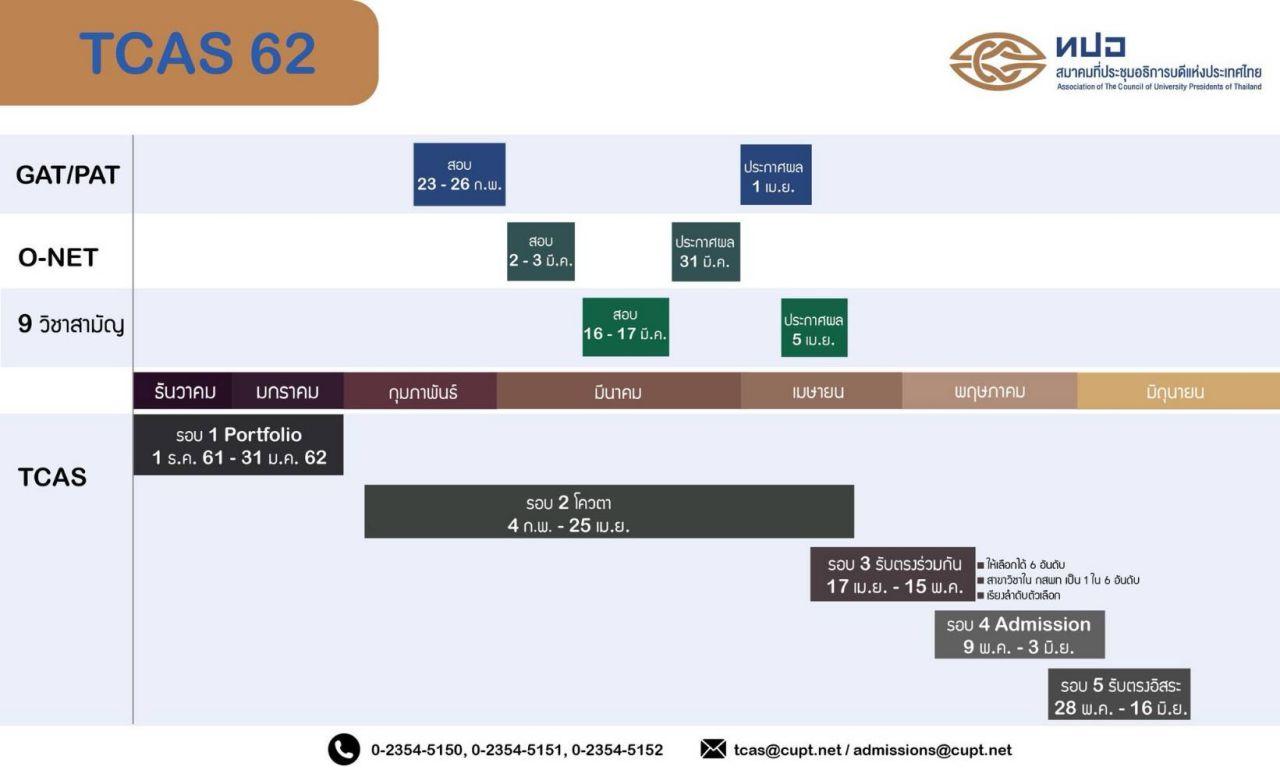 ศาสตราจารย์ ดร.สุชัชวีร์ สุวรรณสวัสดิ์ ประธานที่ประชุมอธิการบดีแห่งประเทศไทย (ทปอ.) และอธิการบดีสถาบันเทคโนโลยีพระจอมเกล้าเจ้าคุณทหารลาดกระบัง (สจล.) กล่าวว่า ขณะนี้ ทปอ.ได้มีมติรับรองระบบการคัดเลือกบุคคลเพื่อเข้าศึกษาในสถาบันอุดมศึกษา ปี 2562 (TCAS 62) เป็นที่เรียบร้อยแล้ว และต้องการให้นักเรียนทราบกรอบระยะเวลา กำหนดการต่างๆ ล่วงหน้า ในการเตรียมความพร้อมสู่การลงสนามแข่งขันจริง ซึ่ง TCAS 62 ยังคงเปิดให้มีการคัดเลือกทั้งหมด 5 รอบ และมีการปรับระยะเวลาการคัดเลือกให้กระชับขึ้นจากเดิม 10 เดือน เหลือ 6 เดือนครึ่ง คือตั้งแต่เดือนธันวาคม 2561 ไปจนถึง กลางเดือนมิถุนายน 2562 เพื่อให้นักเรียนมีเวลาในการเตรียมความพร้อมสู่ขั้นตอนต่อไปมากขึ้น และรองรับกรอบเวลาที่แต่ละสถาบันเปิดเรียนที่แตกต่างกัน ชี้ให้เห็นว่า ทปอ.ใส่ใจกับปัญหาที่เกิดขึ้นกับ TCAS 61 และนำบทเรียนมาปรับแก้ไขให้ได้มากที่สุด