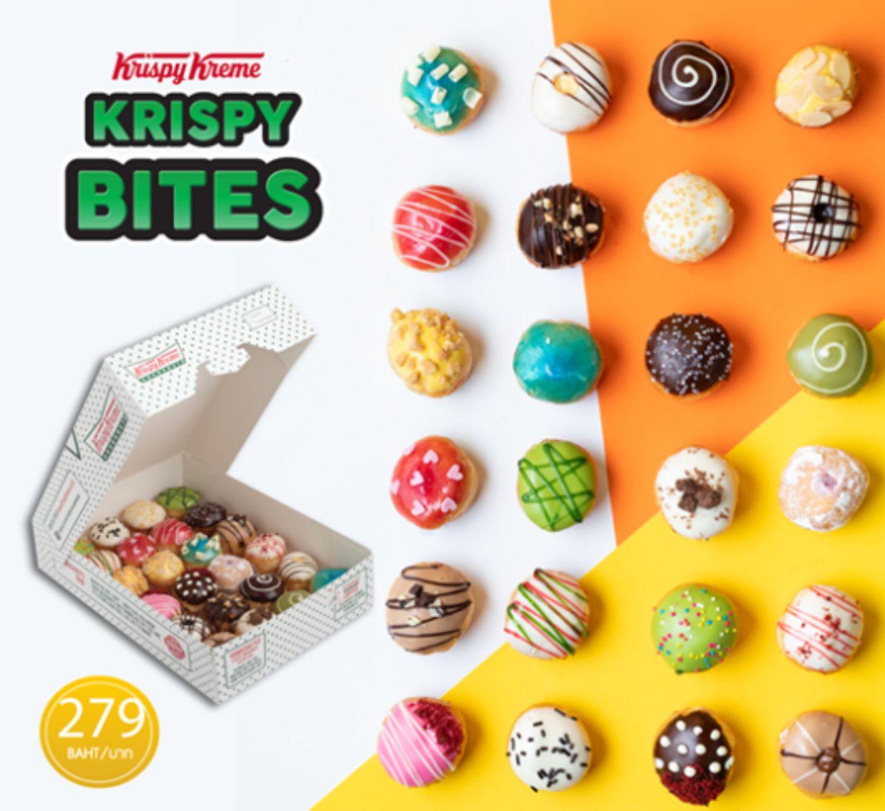 คริสปีครีม โดนัทสูตรลิขสิทธิ์ อันดับ 1 ครองใจคนทั่วโลก สรรสร้างความสนุกพร้อมรสชาติความอร่อยที่พลาดไม่ได้ กับคอลเลคชั่น ‘คริสปี้ ไบทส์ โดนัท’ ด้วยมินิโดนัท 24 รสชาติสุดฟินที่คุณเลือกได้ อาทิ ดาร์ค ช็อกโกแลต สตรอว์เบอร์รี่ ชาเขียว ฮาเซลนัท เรดเวลเวท และอีกมากมาย ในราคา 275 บาท ตั้งแต่วันนี้ถึง -30 กันยายน 2561 ณ ร้าน คริสปีครีม ทั้ง 31 สาขา ใกล้บ้านคุณ