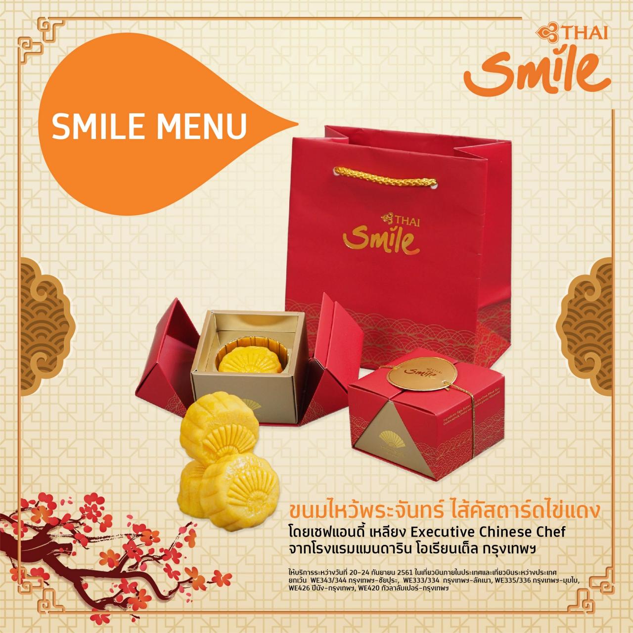 วันที่ 20-24 กันยายน 2561 สายการบินไทยสมายล์ขอร่วมฉลองเทศกาลไหว้พระจันทร์ ด้วย Smile menu ขนมไหว้พระจันทร์ไส้คัสตาร์ดไข่แดง เสิร์ฟคู่กับชาอู่หลงหอมหมื่นลี้ รังสรรค์โดยเชฟแอนดี้ เหลียง (Andy Leong) หัวหน้าแผนกครัวชาวจีน (Executive Chinese Chef) จากโรงแรมแมนดาริน โอเรียนเต็ล กรุงเทพฯ
