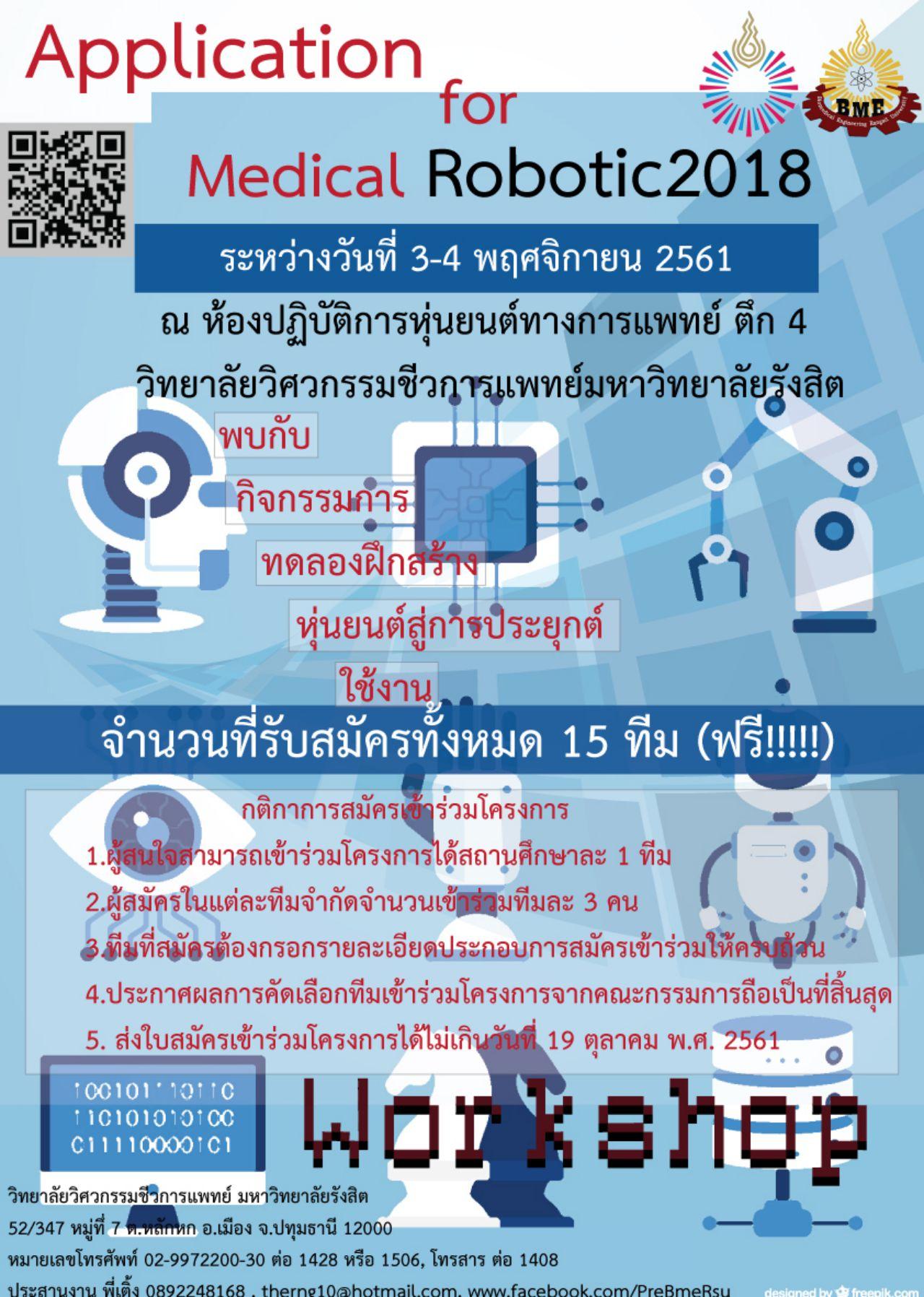 วิทยาลัยวิศวกรรมชีวการแพทย์ มหาวิทยาลัยรังสิต ขอเชิญนักเรียนมัธยมศึกษาตอนปลายที่สนใจ สมัครเข้าร่วมโครงการอบรม Application for Medical Robotic 2018 (ค่าย Pre BME หุ่นยนต์ทางการแพทย์) ครั้งที่ 1 ระหว่างวันที่ 3-4 พฤศจิกายน 2561 ณ ห้องปฏิบัติการหุ่นยนต์ทางการแพทย์ วิทยาลัยวิศวกรรมชีวการแพทย์ อาคาร 4 มหาวิทยาลัยรังสิต ทั้งนี้ รับสมัครจำนวนจำกัด 15 ทีม (ฟรี! ค่าสมัคร, ค่าอุปกรณ์ต่างๆ) สำหรับผู้ที่สนใจสามารถสมัครได้ตั้งแต่บัดนี้จนถึงวันที่ 19 ตุลาคม 2561 สอบถามเพิ่มเติมได้ที่ พี่เติ้ง 08-9224-8168