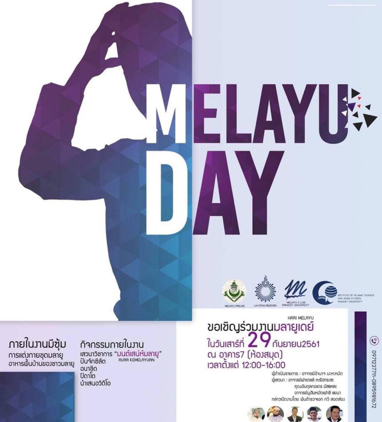ชมรมมลายู คณะศิลปศาสตร์ มหาวิทยาลัยรังสิต จัดกิจกรรม “MELAYU DAY” ในวันเสาร์ที่ 29 กันยายน 2561 เวลา 12.00 น. เป็นต้นไป ณ ห้อง 7-100 อาคารหอสมุด (อาคาร 7) มหาวิทยาลัยรังสิต โดยได้รับเกียรติจาก พ.ต.อ.ทวี สอดส่อง อดีตที่ปรึกษาสำนักนายกรัฐมนตรี เป็นประธานในพิธีเปิด ภายในงานพบกับการเสวนาวิชาการ หัวข้อ “มนต์เสน่ห์มลายู (AURA KEMELAYUAN)” นอกจากนี้ยังมีการแสดงปันจักสีลัต การกล่าวสุนทรพจน์ (ปีดาโต) การขับร้องอนาชีด นิทรรศการแสดงการแต่งกาย และอาหารพื้นบ้านของชาวมลายู สอบถามเพิ่มเติมได้ที่ 09-7123-7711