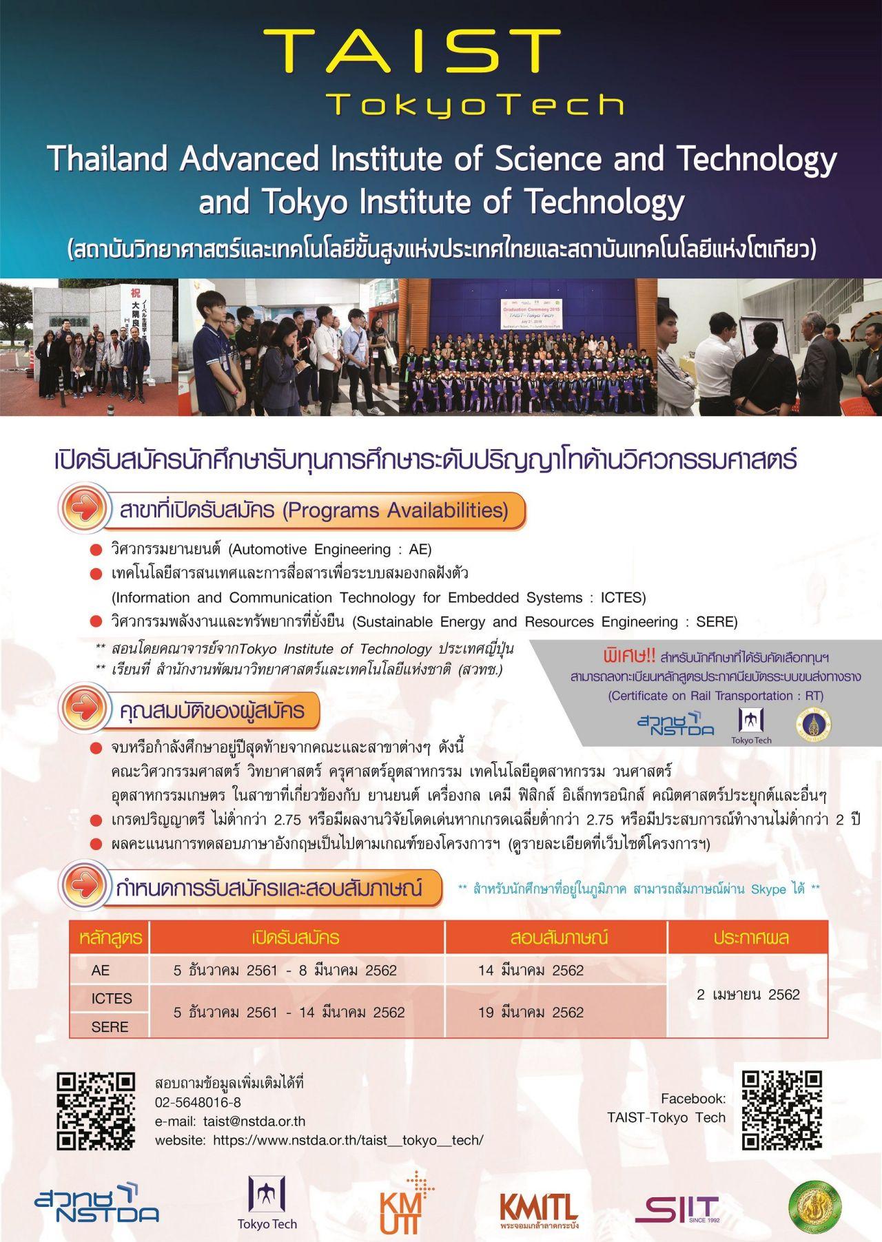 สำนักงานพัฒนาวิทยาศาสตร์และเทคโนโลยีแห่งชาติ (สวทช.) ร่วมกับ สถาบันเทคโนโลยีแห่งโตเกียว (Tokyo Tech) ประเทศญี่ปุ่น และสถาบันเทคโนโลยีพระจอมเกล้าเจ้าคุณทหารลาดกระบัง สถาบันเทคโนโลยีนานาชาติสิรินธร ม.ธรรมศาสตร์ ม.เกษตรศาสตร์ และ ม.เทคโนโลยีพระจอมเกล้าธนบุรี เปิดรับสมัครนักศึกษาที่จบปริญญาตรีหรือกำลังศึกษาอยู่ปีสุดท้ายที่มีพื้นฐานความรู้ด้านเครื่องกล ยานยนต์ ไฟฟ้า อิเล็กทรอนิกส์ วัสดุ พลังงาน และสิ่งแวดล้อม รวมถึงมีความสามารถและทักษะทำงานวิจัย สื่อสารภาษาอังกฤษได้ดี รับทุนการศึกษาระดับปริญญาโท วิศวกรรมศาสตร์มหาบัณฑิต (นานาชาติ) ในหลักสูตรวิศวกรรมยานยนต์ (AE) เทคโนโลยีสารสนเทศและการสื่อสารเพื่อระบบสมองกลฝังตัว (ICTES) และวิศวกรรมพลังงานและทรัพยากรที่ยั่งยืน (SERE) แต่ละหลักสูตรรับเพียง 30 ทุน เท่านั้น เปิดรับสมัครผ่านเว็บไซต์ www.nstda.or.th/taist_tokyo_tech/ ตั้งแต่วันนี้ถึง 8 มี.ค. (สำหรับหลักสูตร AE) และ 14 มี.ค. 2562 (หลักสูตรอื่นๆ) สอบถามเพิ่มเติม โทร. 0 2564 8016-8 หรือ e-mail: taist@nstda.or.th