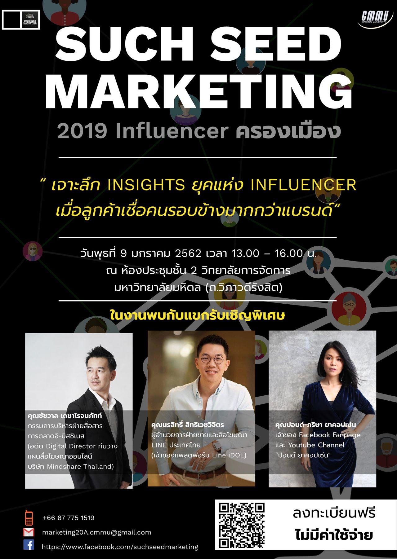 วิทยาลัยการจัดการ มหาวิทยาลัยมหิดล หรือ ซีเอ็มเอ็มยู เชิญร่วมสัมมนา “Such Seed Marketing: 2019 Influencer ครองเมือง” ที่จะพาไปเจาะลึกการทำการตลาดผ่านอินฟลูเอนเซอร์ (Influencer) อย่างไรให้โดนใจผู้บริโภคยุคมิลเลนเนียล พร้อมไฮไลท์เสวนาการตลาด จาก 3 ตัวท็อปในวงการ อย่าง นรสิทธิ์ สิทธิเวชวิจิตร ผู้อำนวยการฝ่ายขายและสื่อโฆษณาจากบริษัทยักษ์ใหญ่อย่าง ไลน์ ประเทศไทย (LINE Thailand) ชัชวาล เดชาโรจนภัทท์ กรรมการบริหารงานสื่อสารการตลาด บริษัทหลักทรัพย์ ฟินันเซีย ไซรัส จำกัด (มหาชน) และ ปอนด์ - ภริษา ยาคอปเซ่น ยูทูปเบอร์คนแรกของเมืองไทย ตัวแม่ผู้บุกเบิกยุคการตลาดอินฟลูเอนเซอร์ ทั้งนี้ กิจกรรมดังกล่าว มีกำหนดจัดขึ้นในวันพุธที่ 9 มกราคม 2561 เวลา 13.00 – 16.00 น. ณ วิทยาลัยการจัดาร มหาวิทยาลัยมหิดล ถ. วิภาวดีรังสิต กรุงเทพฯ โดยไม่มีค่าใช้จ่าย ผู้สนใจสามารถลงทะเบียนสำรองที่นั่งได้ที่ www.zipeventapp.com/e/Such-Seed-Marketing-2019 ตลอดจนสอบถามรายละเอียดเพิ่มเติมได้ที่หมายเลขโทรศัพท์ 02-206-2000 หรือเข้าไปที่ www.cmmu.mahidol.ac.th
