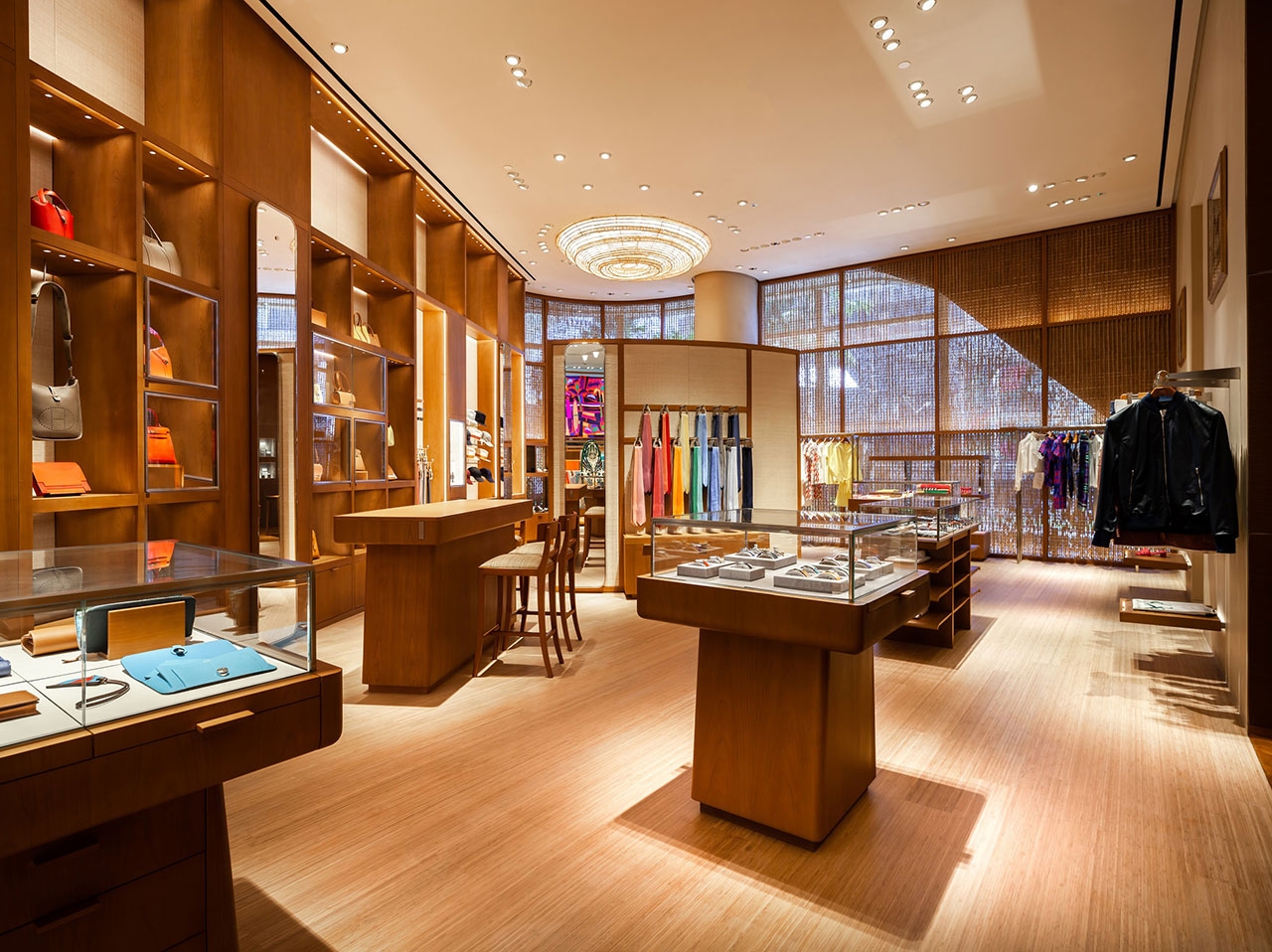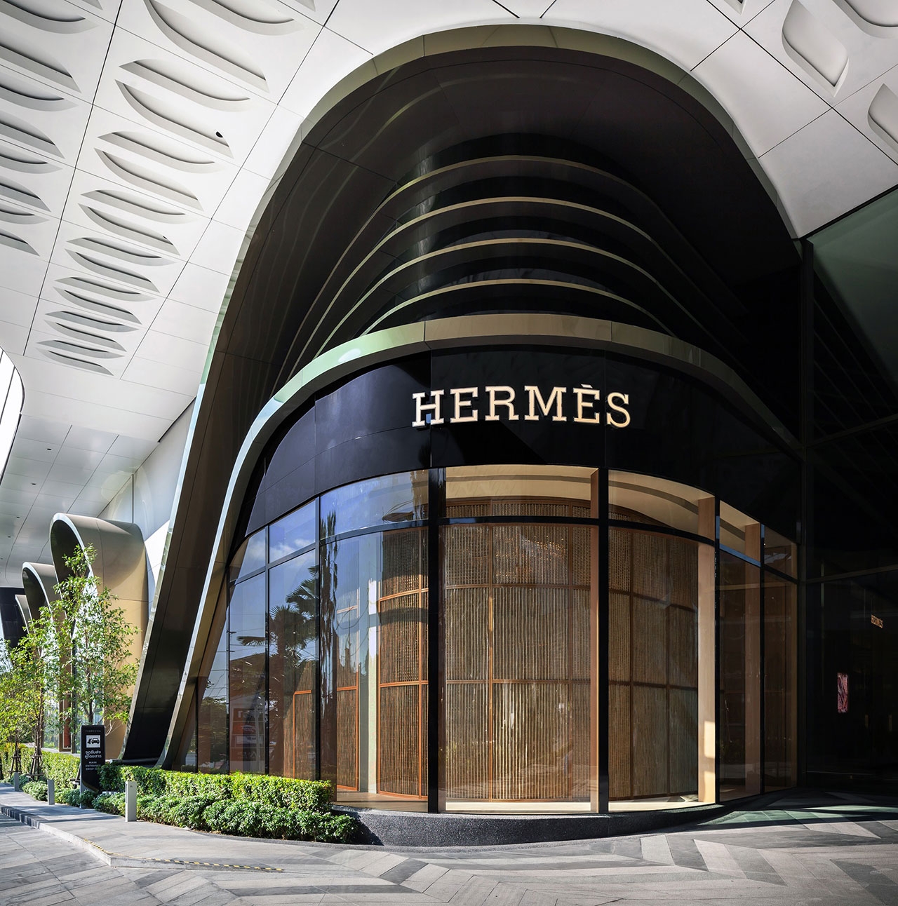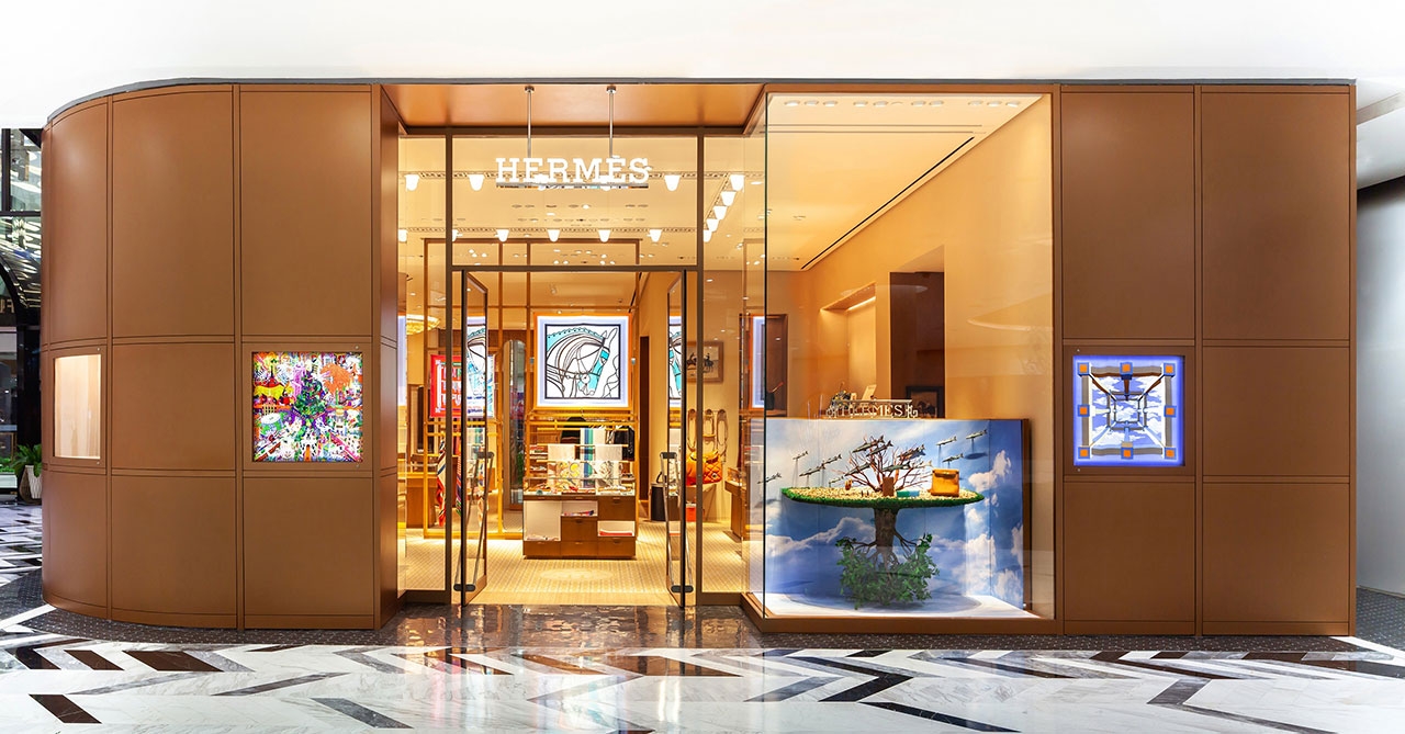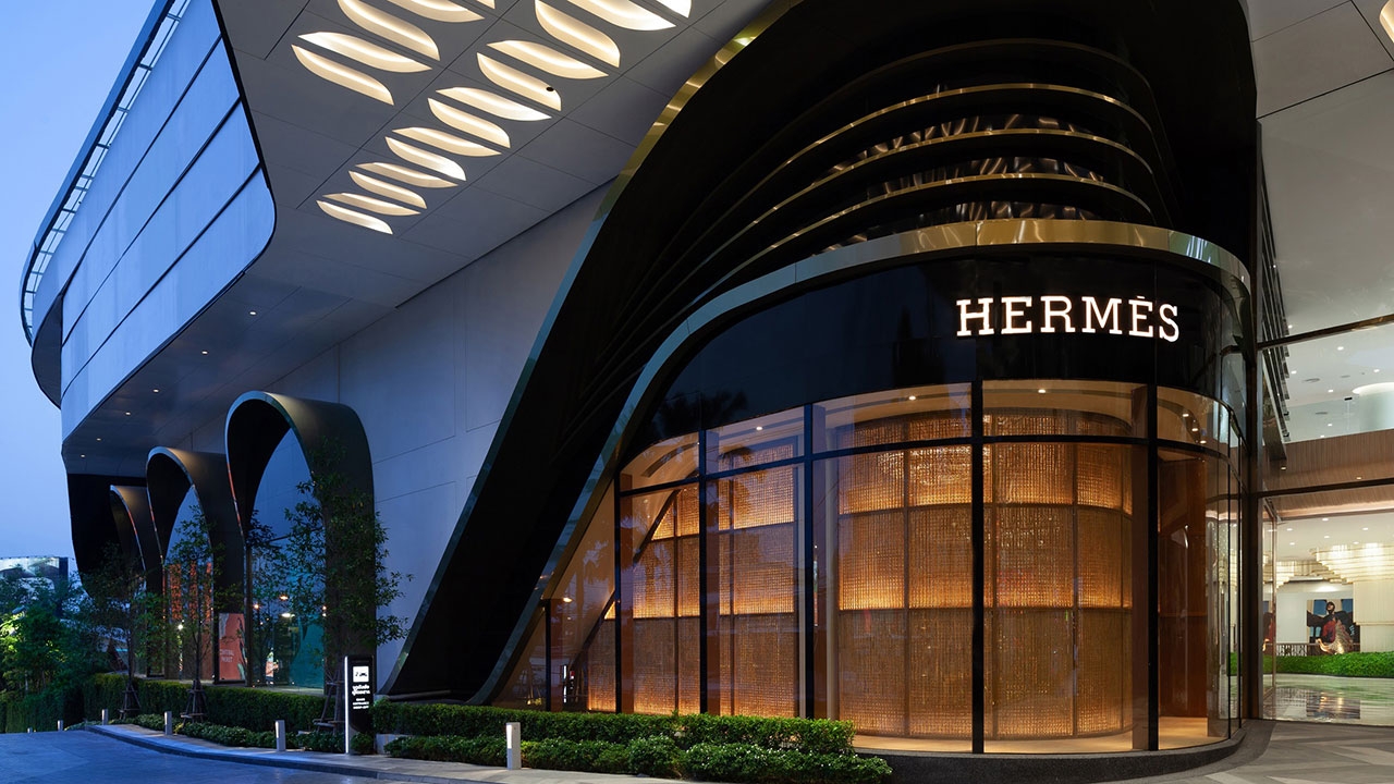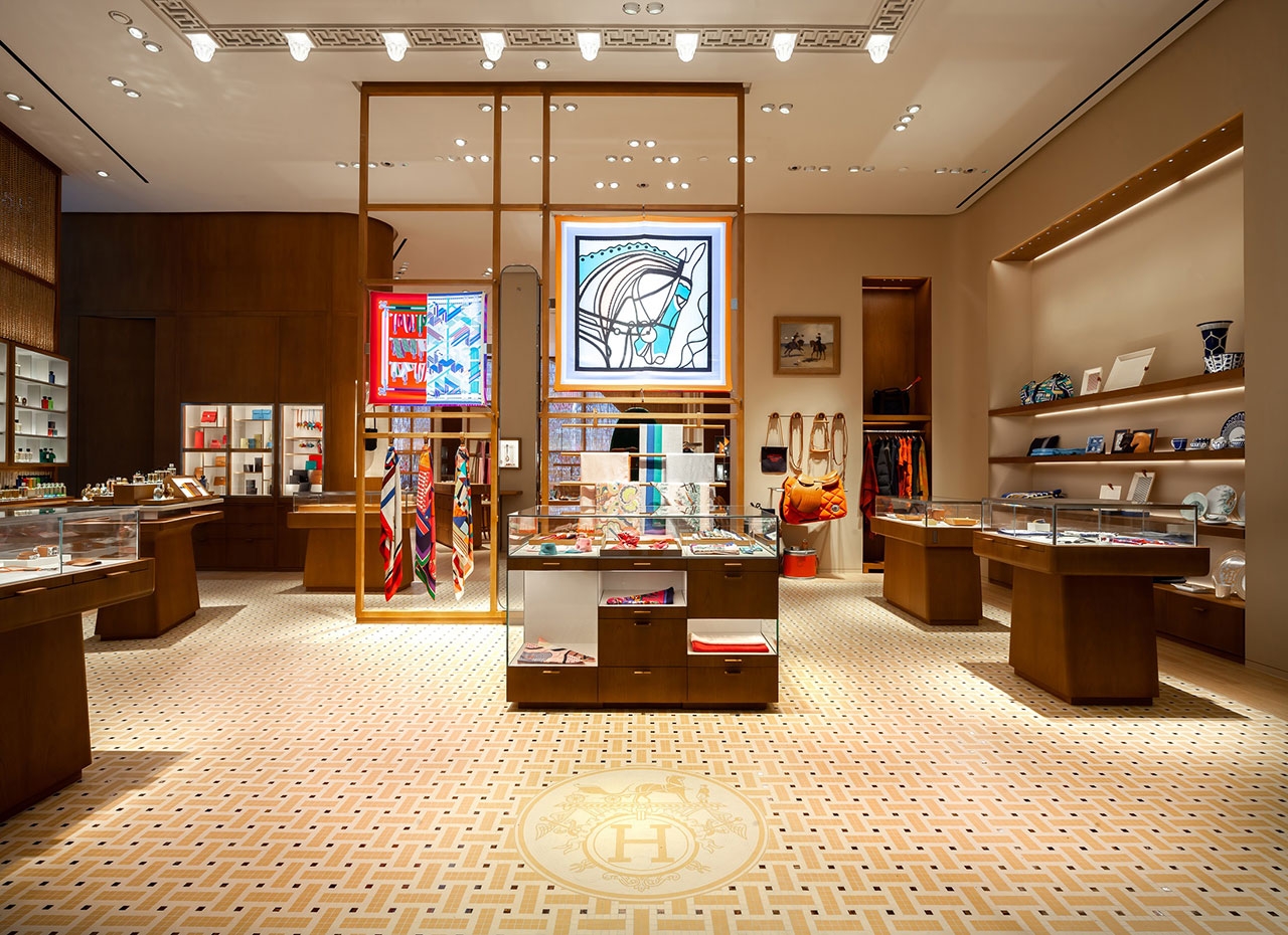 ร้านแห่งใหม่ล่าสุดนี้งดงามด้วยการออกแบบสถาปัตยกรรมจากปารีส โดยบริษัท RDAI บนพื้นที่ 172 ตร.ม. ตั้งอยู่บริเวณทางเข้าด้านหน้าของศูนย์การค้า ผลงานการออกแบบตกแต่งอย่างพิถีพิถันตั้งแต่ภายนอกสู่ภายในร้าน เริ่มตั้งแต่ผลงานอันประณีตจากช่างฝีมือท้องถิ่น บรรจงวางเรียงร้อยฉากกั้นไม้ไผ่สาน ล้อไปกับแนวกระจกด้านนอกอาคาร เกิดเป็นความงดงามสบายตาภายในร้าน จากแสงที่ลอดผ่านแนวไม้ไผ่สานเข้ามา ในส่วนของหน้าร้านที่อยู่ด้านในตัวอาคาร ถูกตกแต่งด้วยโลหะเคลือบสีที่ถูกสร้างสรรค์ขึ้นมาอย่างพิถีพิถัน พร้อมจัดแสดงผ้าพันคอซิลค์อันเป็นเอกลักษณ์เอาไว้ด้านหน้า และตู้โชว์ขนาดใหญ่เพื่อจัดแสดงคอลเลกชั่นต่างๆ