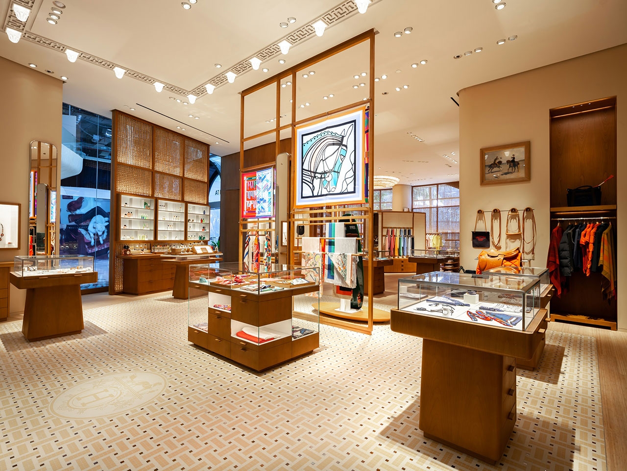 พื้นที่จัดแสดงสินค้าของร้านถูกแบ่งออกเป็นสองส่วนด้วยส่วนจัดแสดงผ้าพันคอสำหรับสตรี ซึ่งตั้งอยู่ตรงทางเข้าร้าน เมื่อก้าวเข้ามาสู่โซนแรก ท่านจะได้พบกับพื้นโมเสค Faubourg อันเป็นเอกลักษณ์ของร้าน ให้ความรู้สึกผ่อนคลายในขณะที่ชมผ้าพันคอซิลค์ เครื่องประดับจิวเวลรี่ น้ำหอม สินค้าตกแต่งบ้านและไลฟ์สไตล์ และสินค้าในกลุ่ม Equestrian ที่เกี่ยวข้องกับม้าอันเป็นต้นกำเนิดของ Hermès ในฝั่งตรงข้ามเป็นโซนสำหรับเครื่องหนัง มีพื้นที่กว้างขวางและเป็นส่วนตัว เชื้อเชิญให้แขกผู้มาเยือนได้ชมคอลเลกชั่นนาฬิกาและจิวเวลรี่ รวมทั้งเครื่องแต่งกายของบุรุษและสตรี โดยพรมสีทรายขนาดใหญ่ที่ปูลาดไว้ นำพาท่านเข้าไปยังส่วนจัดแสดงคอลเลกชั่น รองเท้า ซึ่งในโซนนี้ได้รับการตกแต่งให้ดูอบอุ่นและสะดุดตาด้วยโคมไฟไม้ไผ่ที่ถูกสร้างสรรค์ขึ้นเฉพาะสำหรับ Hermès สาขาภูเก็ต