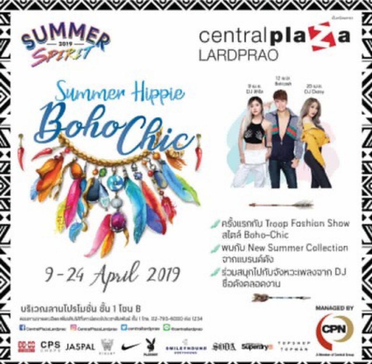 เปลี่ยนซัมเมอร์ร้อนให้เป็นฤดูกาลแห่งความสุขและความสนุกกับการอัพเดทเทรนด์แฟชั่นใหม่ๆ ท้าลมร้อน ที่ ศูนย์การค้าเซ็นทรัลพลาซา ลาดพร้าว ด้วย Troop Fashion Show (ทรูปแฟชั่นโชว์) ครั้งแรก! กับคอลเลกชันใหม่ซัมเมอร์นี้จากแบรนด์ดังโดยเหล่านายแบบนางแบบสุดฮิป ในงาน SUMMER HIPPIE BOHO CHIC 2019 ทั้งยังได้รวบรวมทุกไลฟ์สไตล์การใช้ชีวิตในแบบหนุ่มสาวโบฮีเมียนมารวมไว้ที่ บริเวณลานโปรโมชั่น ชั้น 1 โซน บี ศูนย์การค้าเซ็นทรัลพลาซา ลาดพร้าว ตลอดซัมเมอร์นี้ เริ่มอังคารที่ 9 เมษายน ถึง 24 เมษายน นี้ พร้อมพบกับความมันส์จากเหล่าดีเจชื่อดังที่จะมาร่วมสร้างสีสันในงาน อาทิ ดีเจฟ้า ดีเจ BOTCASH และดีเจ DAISY ไม่อยากตกเทรนด์ ไม่ควรพลาดงานนี้!