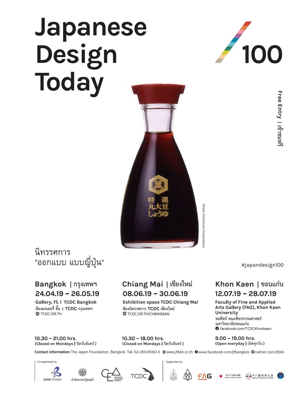 นิทรรศการ “ออกแบบ แบบญี่ปุ่น” พร้อมเปิดให้นักออกแบบ คณาจารย์ นักศึกษา ในแวดวงอุตสาหกรรมงานออกแบบ ตลอดจนประชาชนทั่วไป เข้าชมผลงานการออกแบบระหว่างวันที่ 24 เมษายน - 26 พฤษภาคม 2562 เวลา 10.30 - 21.00 น. (ทุกวันอังคาร - วันอาทิตย์) ณ ห้องแกลอรี่ ชั้น 1 อาคารส่วนหลัง ศูนย์สร้างสรรค์งานออกแบบ (TCDC) อาคารไปรษณีย์กลาง ถนนเจริญกรุง กรุงเทพฯ สอบถามข้อมูลนิทรรศการและการเดินทางเพิ่มเติมได้ที่ 02-105-7400 ต่อ 213, 214 หรือติดตามรายละเอียดที่ tcdc.or.th และ #japandesign100