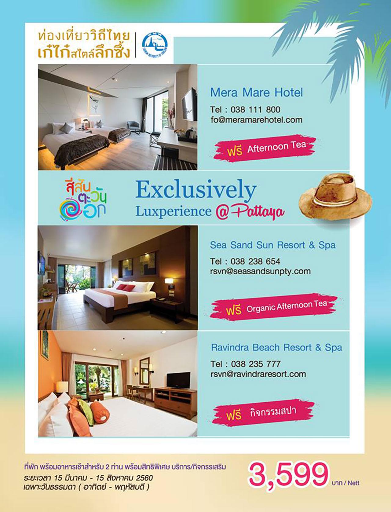 - Exclusively Luxperience @ Pattaya ห้องพักราคาพิเศษ 3,599 บาท รวมอาหารเช้า สำหรับ 2 ท่าน ฟรี กิจกรรมเสริม อาทิ Afternoon Tea หรือกิจกรรมสปา สำรองห้องพักล่วงหน้าและใช้บริการได้ ณ โรงแรมที่เข้าร่วมโครงการ ได้แก่ Mera Mare Hotel, Sea Sand Sun Resort & Spa และ Ravindra Beach Resort & Spa เริ่ม 15 มี.ค. - 15 ส.ค. 2560 เฉพาะวันธรรมดา (อาทิตย์-พฤหัสบดี)