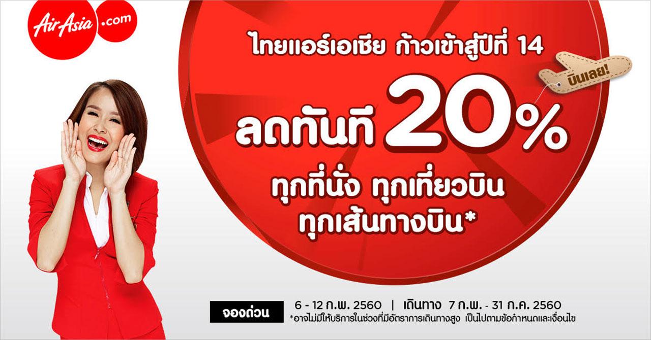 วันนี้-12 ก.พ. 2560 สาวขาเที่ยวอย่าพลาดจองตั๋วเครื่องบินโปรโมชั่นสุดคุ้ม โดยสายการบินแอร์เอเชียฉลองเข้าสู่ปีที่ 14 แอร์เอเชียมอบโปรโมชั่นพิเศษ ลดราคา 20% ทุกที่นั่ง ทุกเที่ยวบิน ทั้งในประเทศและต่างประเทศ ไม่ว่าจะเป็นเชียงราย เชียงใหม่ น่าน อุบลราชธานี อุดรธานี บุรีรัมย์ ขอนแก่น สกลนคร เลย นครพนม พิษณุโลก สุราษฎร์ธานี นครศรีธรรมราช หาดใหญ่ ภูเก็ต นราธิวาส