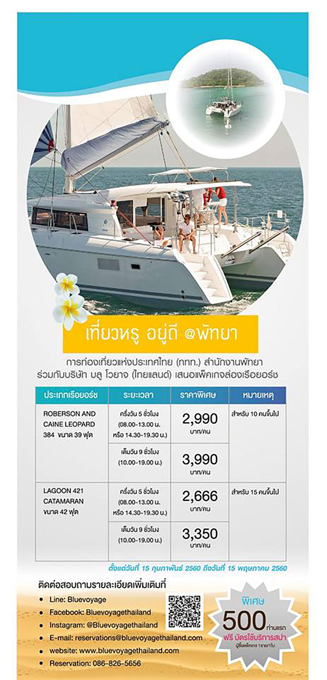 - เที่ยวหรู อยู่ดี @ พัทยา ร่วมกับบริษัท บลู โวยาจ (ไทยแลนด์) เสนอแพ็กเกจล่องเรือยอชต์ครึ่งวัน ในราคาเริ่มต้น 2,666 บาท ตั้งแต่วันที่ 15 ก.พ. - 15 พ.ค. 2560 พิเศษ 500 ท่านแรก รับบัตรใช้บริการสปาหรือออนเซ็นที่ยูโนโมริ ออนเซ็น สปา พัทยา