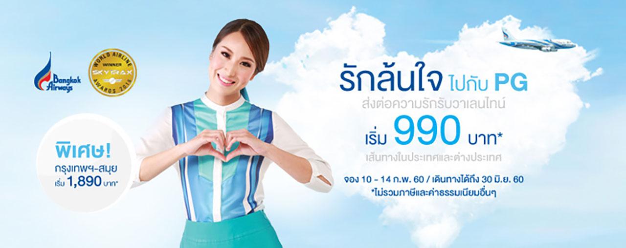 วันนี้ - 14 ก.พ. 2560 มาจองตั๋วเครื่องบินราคาโปรโมชั่น “รักล้นใจ ไปกับ PG” ส่งต่อความรักรับวาเลนไทน์ เสนอบัตรโดยสารราคาพิเศษเส้นทางบินภายในประเทศ (ยกเว้นสมุย) และเส้นทางบินระหว่างประเทศราคาพิเศษ เริ่มต้นเพียง 990 บาทต่อเที่ยวบิน (ราคานี้ยังไม่รวมภาษีสนามบินและค่าธรรมเนียมอื่นๆ) และบัตรโดยสารราคาพิเศษในเส้นทางบินภายในประเทศที่เข้า-ออกสมุย เริ่มต้นเพียง 1,790 บาทต่อเที่ยวบิน (ราคานี้ยังไม่รวมภาษีสนามบินและค่าธรรมเนียมอื่นๆ)